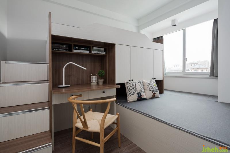 次臥重點考慮的是空間的靈動感和功能的多樣性,室內(nèi)設計師吸收了傳統(tǒng)高低床以及榻榻米的優(yōu)勢,一款集儲物、辦公、高低床于一體的多功能型榻榻米誕生了。