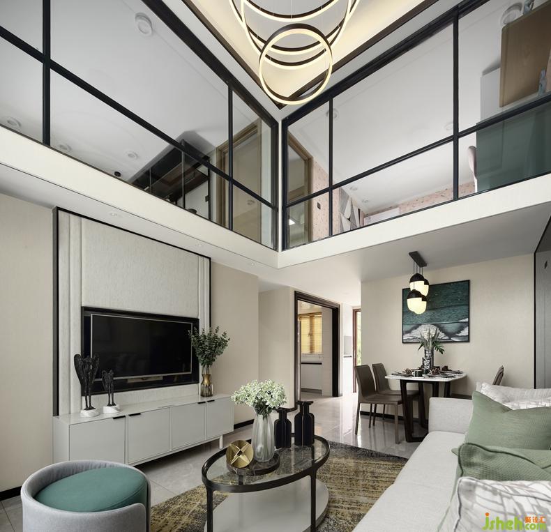 時(shí)代豪庭B戶型雙層公寓樣板間采用半圍合式布局,充當(dāng)對(duì)外空間的客廳作為設(shè)計(jì)的中心貫穿整體空間。具有金屬質(zhì)感的吊燈自二層頂端懸垂而下,金屬框架和玻璃組成的空間隔斷,以及客廳與餐廳之間的開放式連接,設(shè)計(jì)公司打破了傳統(tǒng)LOFT格局的狹窄和蔽攏,讓有限空間得到盡可能的放大和延伸。