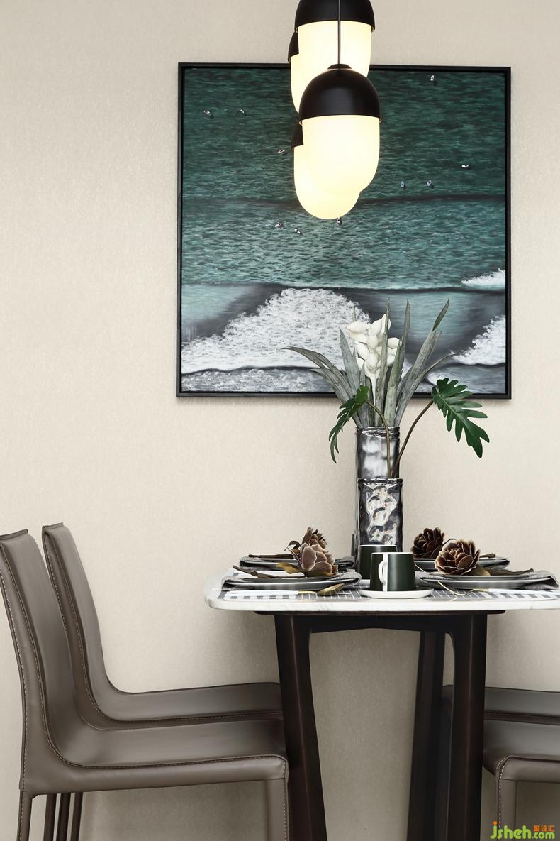 在整體布局上,設(shè)計(jì)則普遍運(yùn)用了點(diǎn)線面的組合,圓形的吊燈、布藝座椅和鋼制玻璃桌,抽象的掛畫、沙發(fā)等,于簡約的外在體現(xiàn)中充滿了復(fù)雜多變的創(chuàng)作組合。