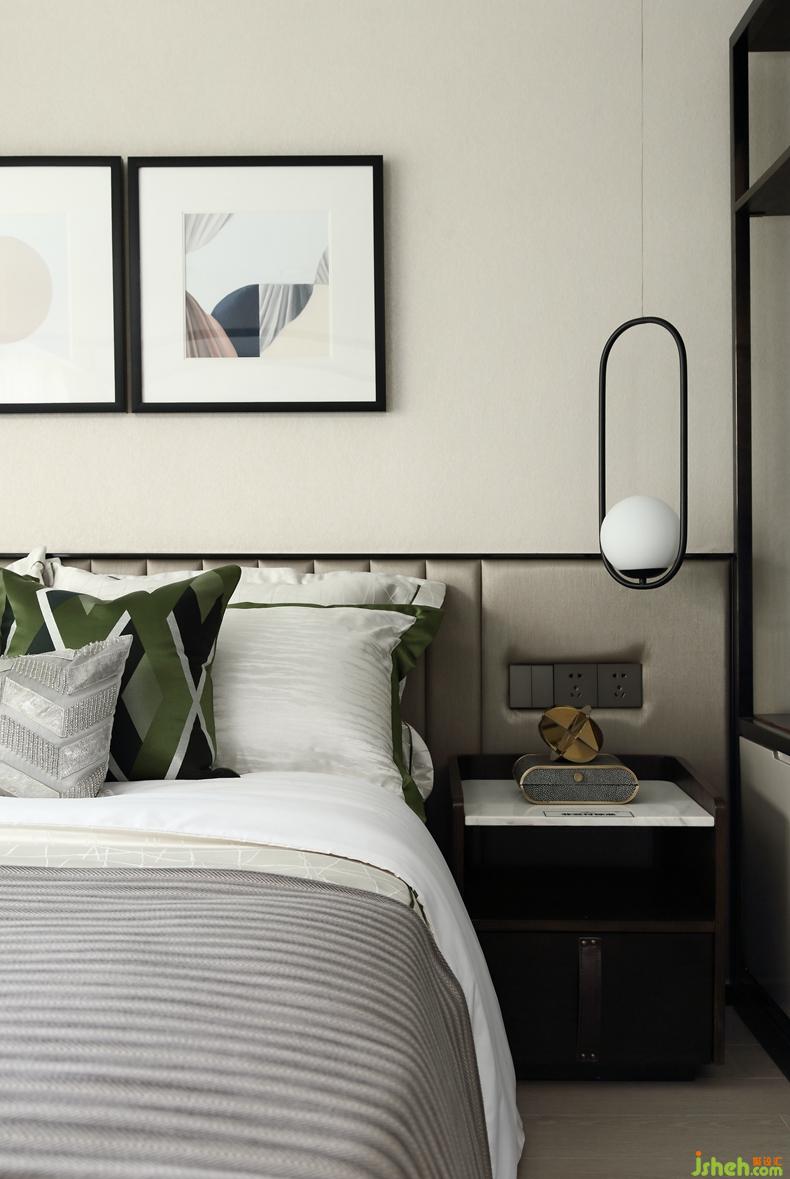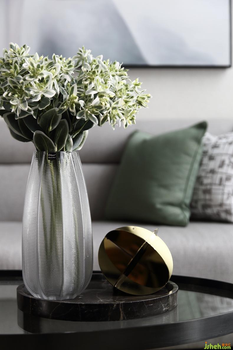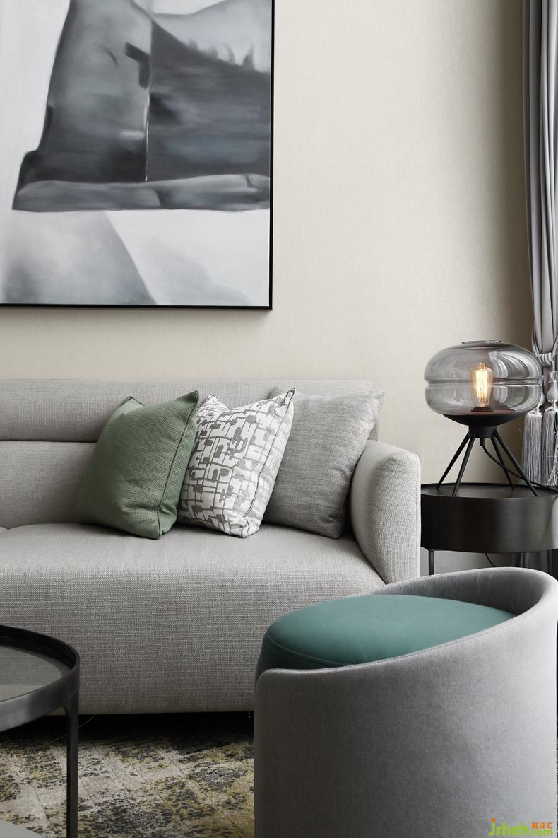 墻面、沙發(fā)、窗簾及床飾使用了統(tǒng)一的米灰色調(diào),而綠色調(diào)的巧妙使用,如斑駁的深綠地毯、置于桌臺(tái)茶幾的植物盆摘和餐具,以及懸掛于臥室的裝飾畫等,又讓整體氛圍多了清新自然的氣息,讓人感到心情明快。