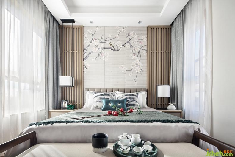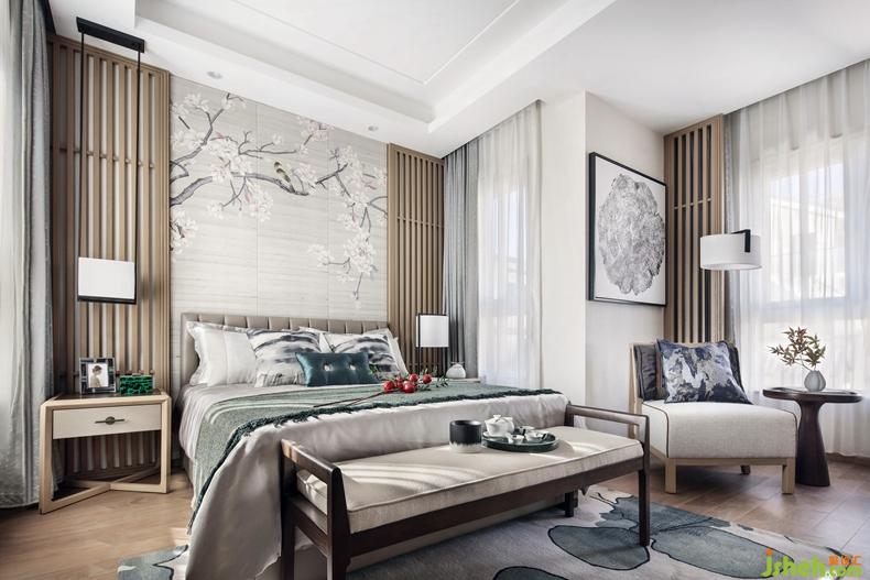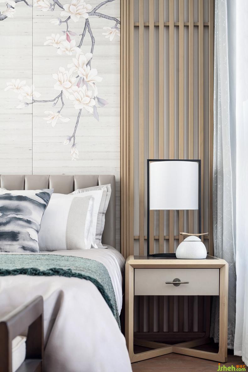 主臥設(shè)計,以桃花為主題創(chuàng)作空間,清雅十足。原木格柵在這里得以延用。別墅裝修設(shè)計現(xiàn)代精致的藝術(shù)陳設(shè),貼近自然的生活氣息,是設(shè)計師關(guān)于理想化生活空間的思考與探求。