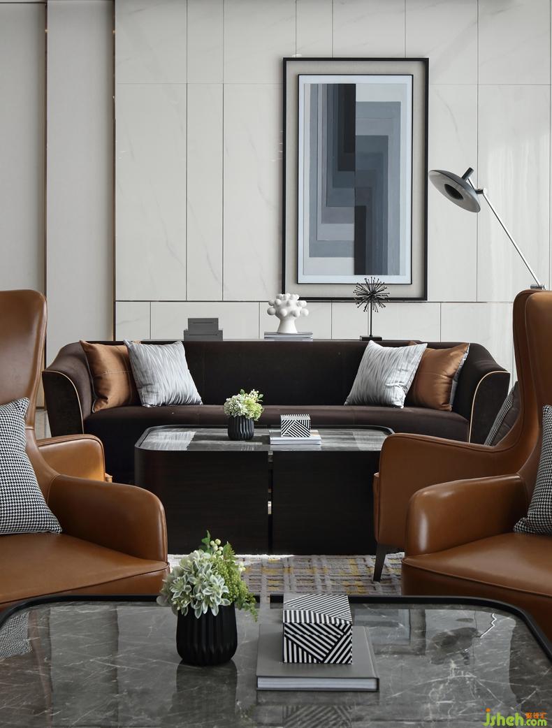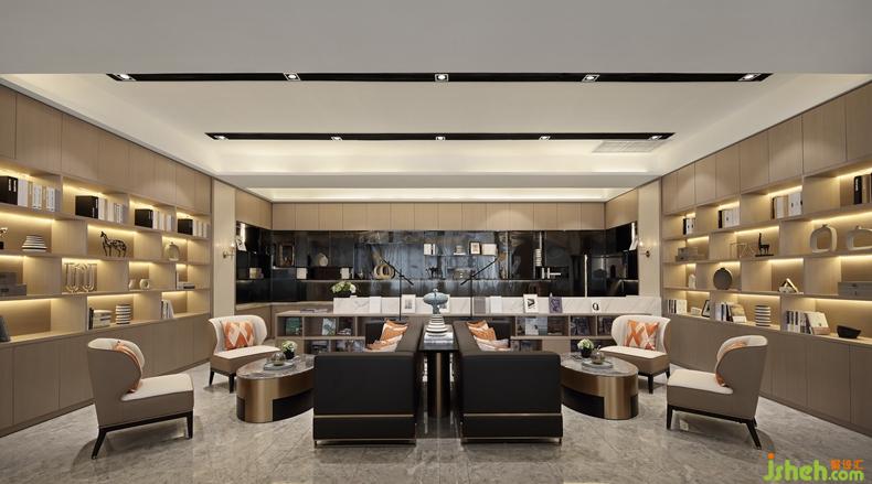 洽談區(qū)內(nèi)部依然保持著對稱的設計,銷控臺與另一側(cè)的水吧遙相呼應,從整體到局部,設計師的思考保持一始而終的嚴謹,延生出空間的儀式感。兩側(cè)的飾畫均借助了光影的藝術堆疊,而曲線和直線的極致對比讓空間瞬間變得生動起來。