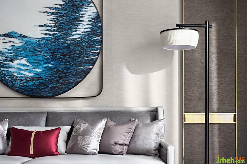 客廳中實木復合地板相互拼合,與墻面淺色裝飾壁紙和白色天花形成明暗色對比,彰顯沉穩(wěn)、大氣的空間氣韻。古人擅用圓,現(xiàn)代擅用方,客廳中外方內圓的掛畫代表了傳統(tǒng)元素與現(xiàn)代風格的完美融合,也展現(xiàn)君子之行方圓有度的高潔品質。