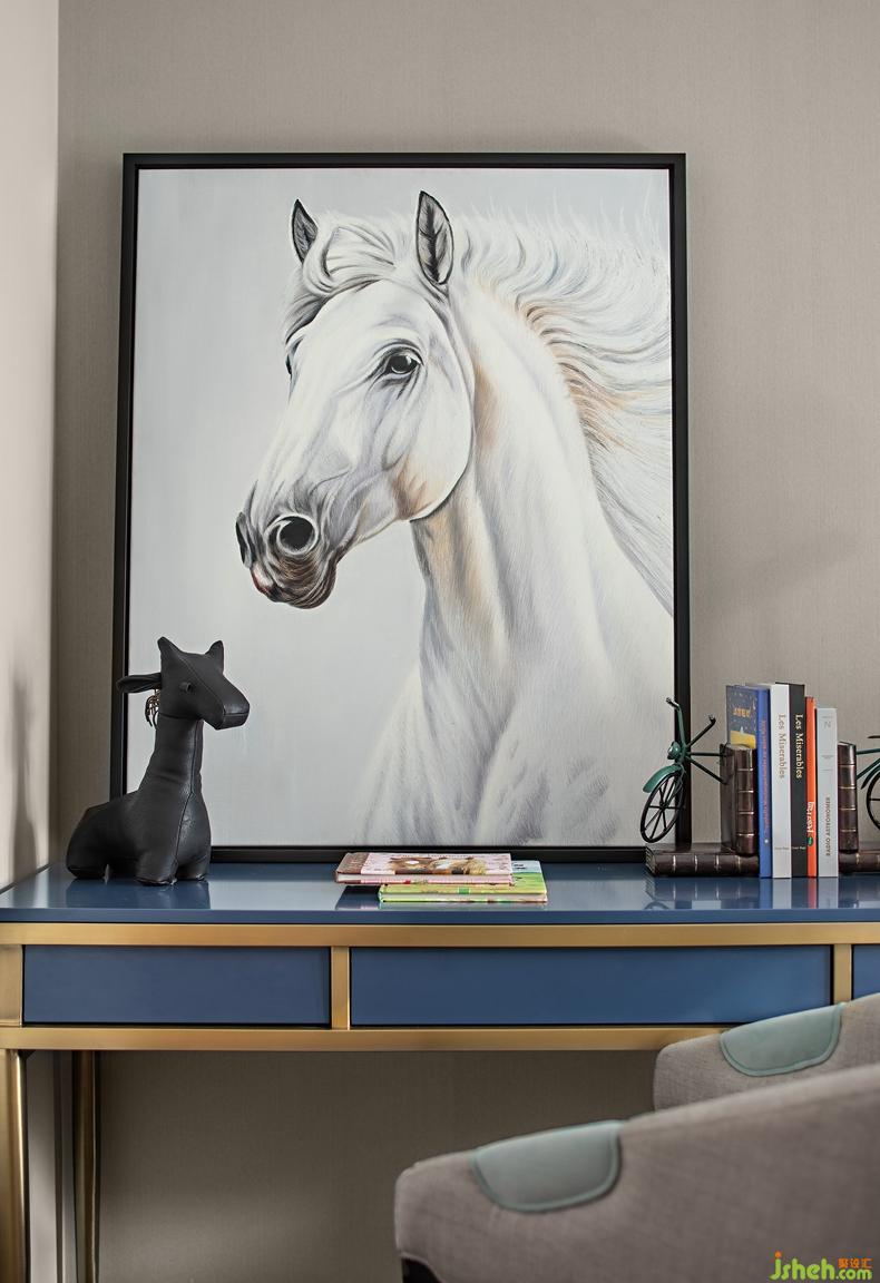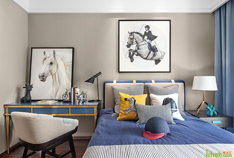 在兒童房的軟裝陳設上,設計仍然以藍色為主調(diào),同時融入動感的馬術元素,為空間增添活力。