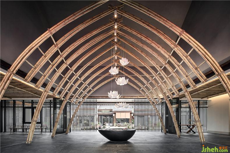 佛家有言,水生蓮,蓮生萬物,步入接待中心,竹制拱形造型與蓮花藝術(shù)裝置映入眼簾,花間見禪,物物融于造化,此取意化境“曲徑通幽,步步生蓮”。往來視之,清心悅神,借景以修身養(yǎng)性,而塵心漸息,最終歸于寧靜。