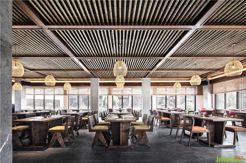 入口處,取自田間的南瓜瓜藤被巧妙用作空間中的藝術(shù)裝置,演繹田園之樂。整個(gè)空間輔以大量的竹木,意蘊(yùn)古樸,光影變化中,增添了清新和雅氣息。