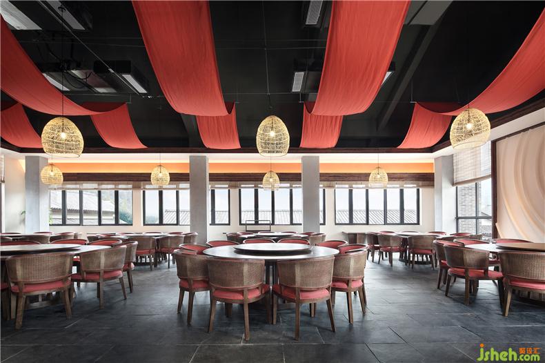 一樓素食餐廳色調(diào)暖黃,曰晨,曰向陽,寓意初生的太陽,一日之晨,酒店設(shè)計(jì)生機(jī)無限;二樓的葷食餐廳則色彩濃烈,紅色彩帶如行云流水般點(diǎn)綴其間,起心念,動(dòng)食指,噴薄而熱烈,充滿能量。設(shè)計(jì)師希望人們在用餐時(shí)懂得珍惜和感恩。