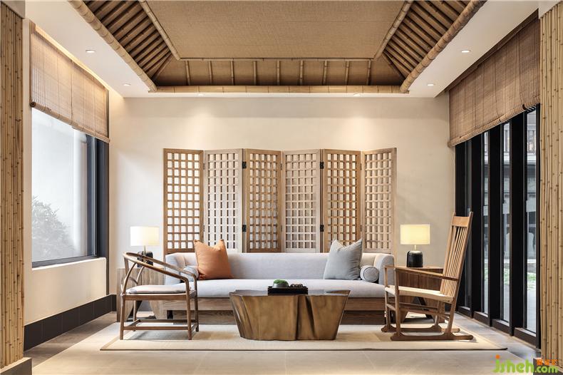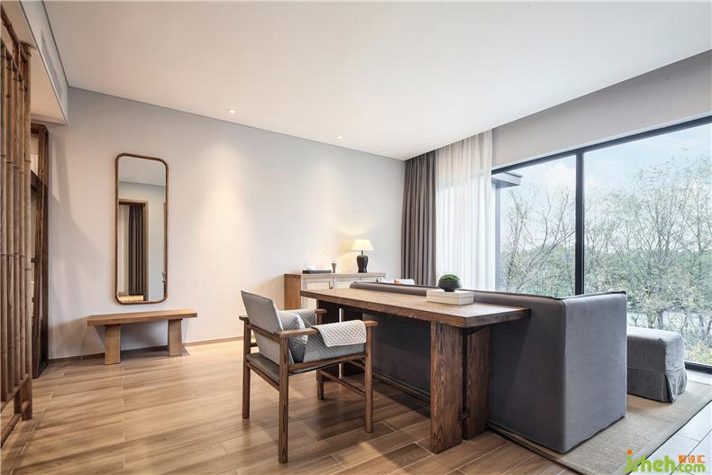 杏花柔媚,花色潔白,大堂延續(xù)著素雅之美;樹榴茶桌長短廣狹不齊,置之于室,古雅溫潤;從疏線到編織,劍麻地毯的鋪陳,簡樸之中清新蔓延。