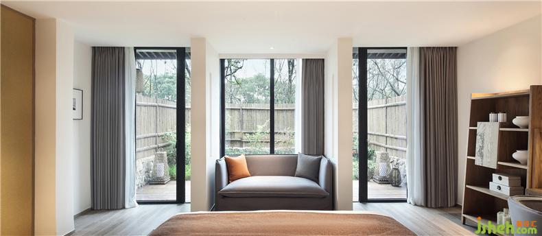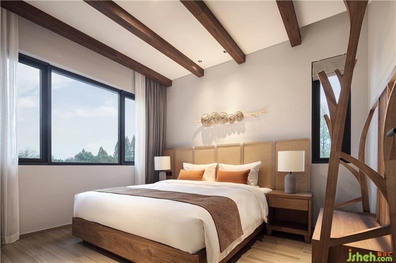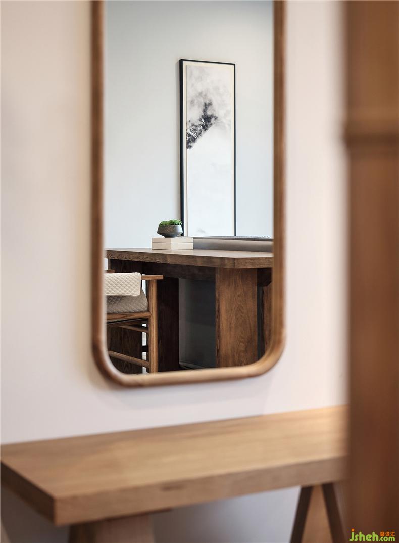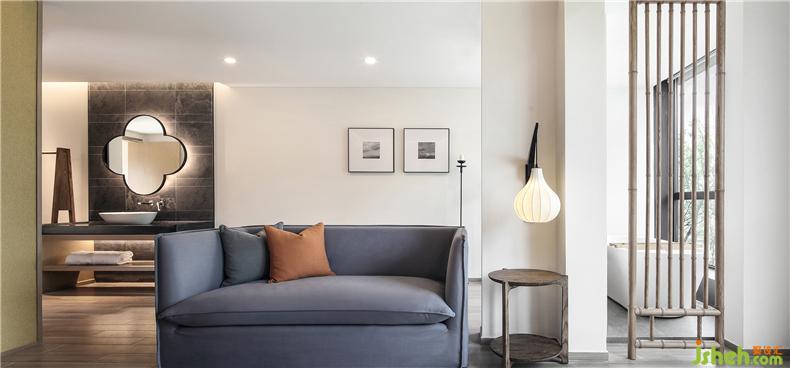 床頭藝術(shù)掛件取自“一枝獨秀”的花枝形態(tài),以此呼應(yīng)杏花居的主題?;居袝r,幽居以花為伴,一室清雅,更自可愛。