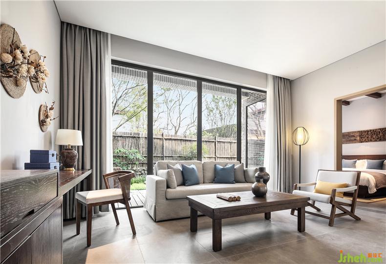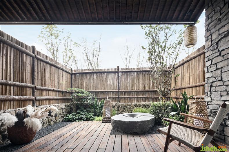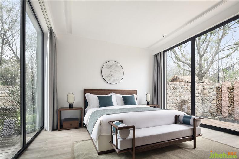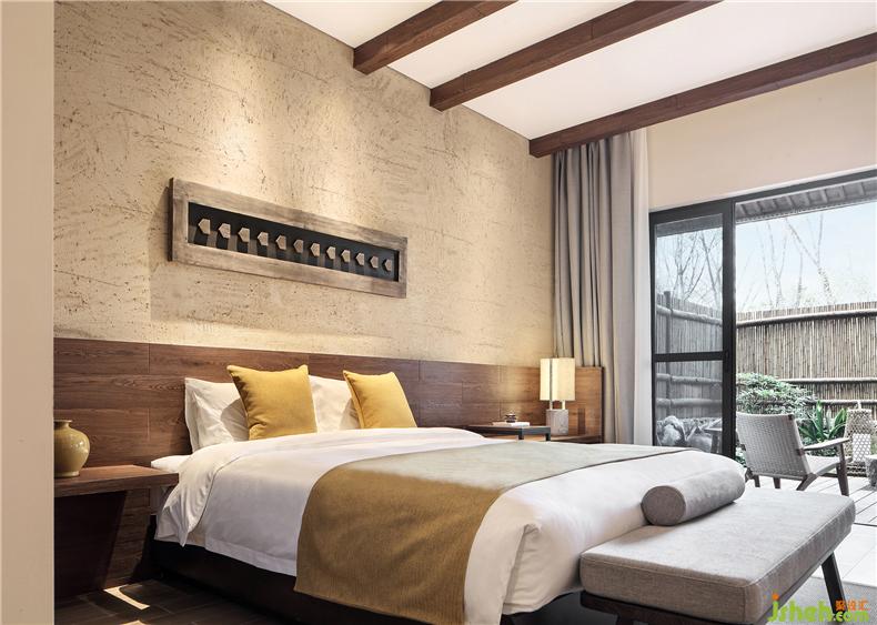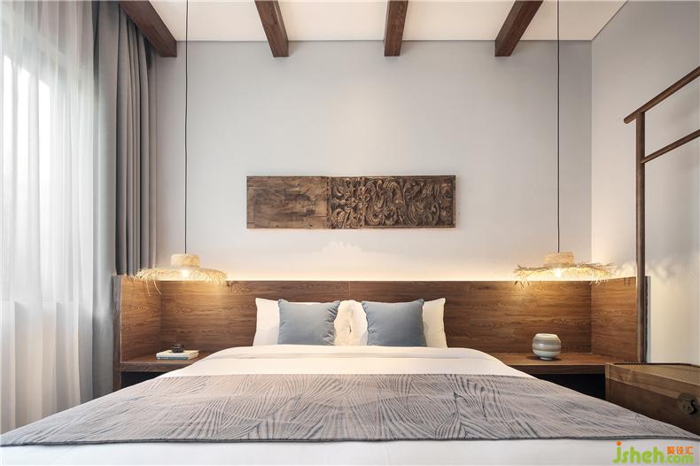 客房布草裝飾選用棉麻材質(zhì),色彩過渡柔和,給人暖意。酒店設(shè)計(jì)床頭的實(shí)木雕畫回歸原野古樸,竹編吊燈造型各異,一花一草一木皆入景,簡而裁,巧而自然。竹藏風(fēng)雨,觸及野趣,山居生活隱逸悠然,靜念生長。
