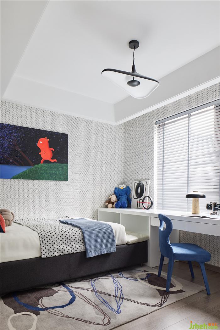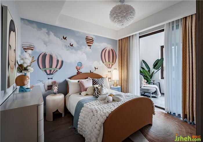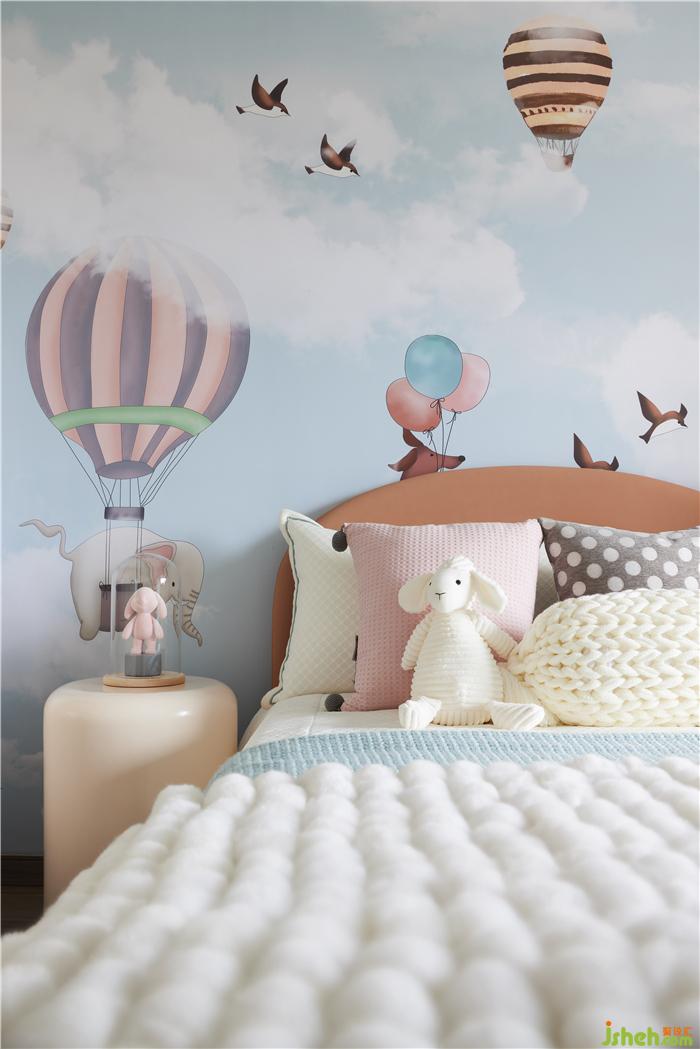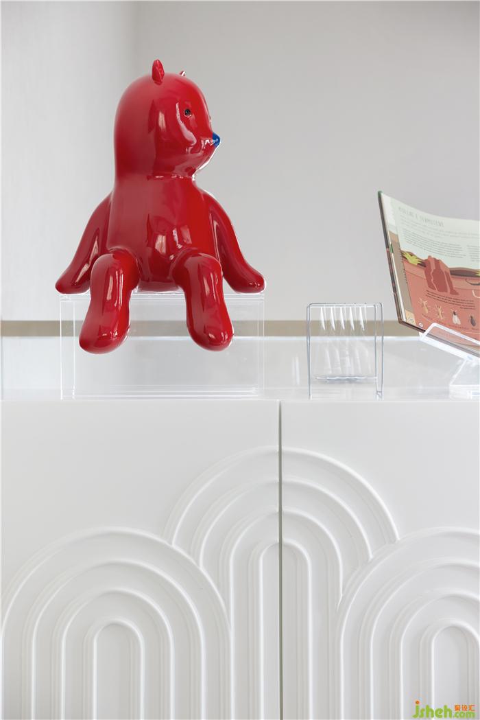 男孩房的空間靈感來(lái)自于林占占藝術(shù)家筆觸下的童話世界——荒野、怪獸、夜空,樣板房設(shè)計(jì)還有那只從自然中走來(lái)的紅色pupu熊,它在奔跑,它在等待,卻從未忘記尋找治愈的力量。