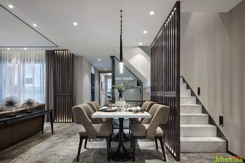 位于一層的客廳與餐廳聯(lián)通共享處理,巧妙起到放大客廳整體空間的視覺效果。