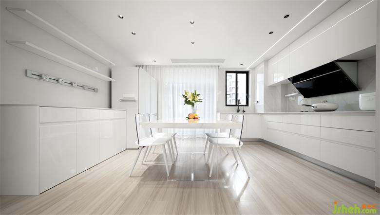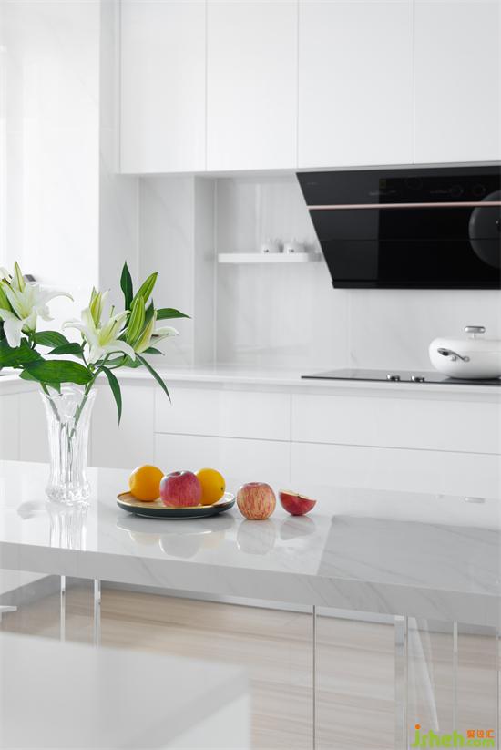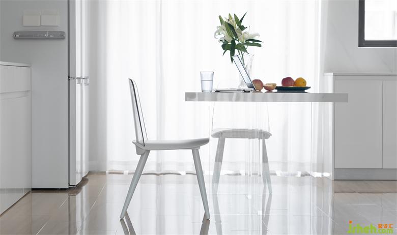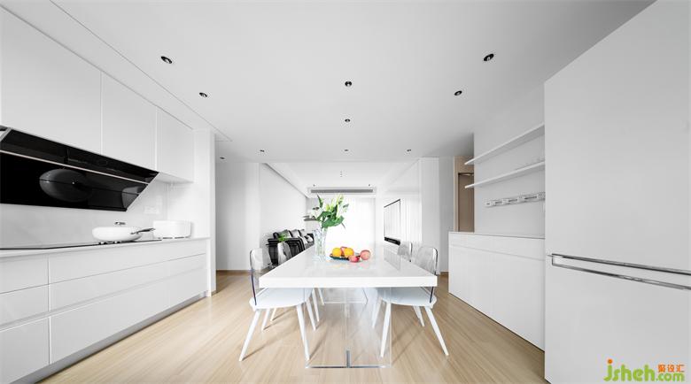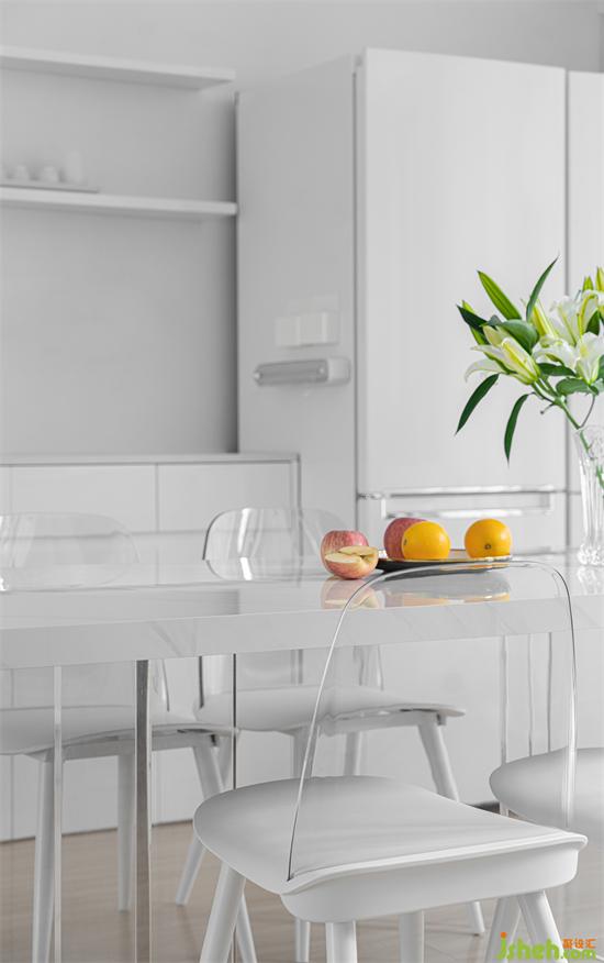 本案室內(nèi)設(shè)計(jì)師跟業(yè)主溝通后,以開放式廚房來設(shè)計(jì),解決餐廚空間偏小的痛點(diǎn),搭配白色巖板餐桌及透明亞室內(nèi)設(shè)計(jì)師克力餐椅,讓整個(gè)餐廚空間和客廳融為一體,空間感最大化。