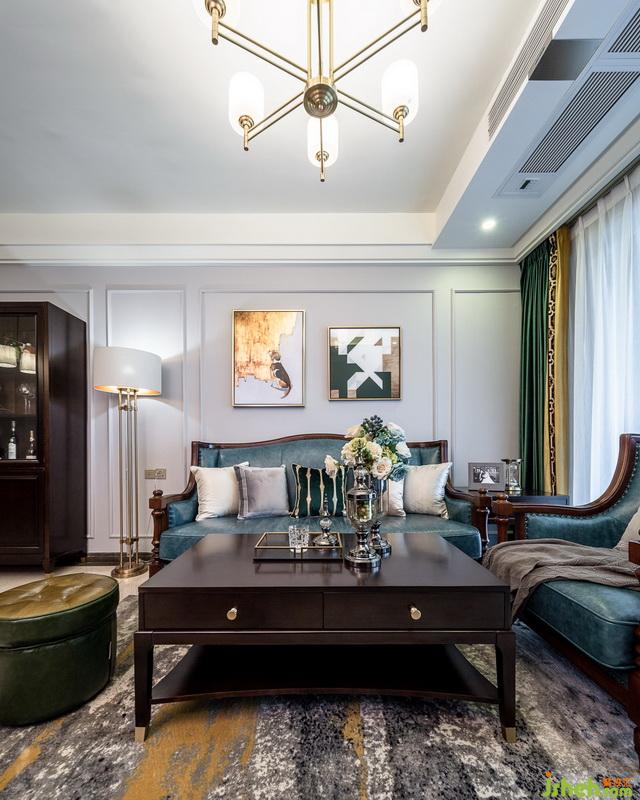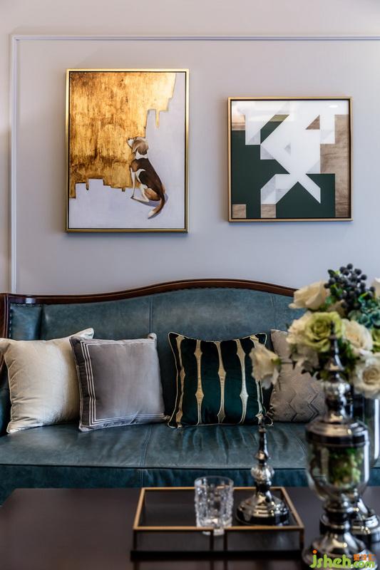 沙發(fā)整套都從原來(lái)住所搬過(guò)來(lái)的,傳統(tǒng)的美式。放在現(xiàn)在空間里有點(diǎn)太重,只有通過(guò)其他物件來(lái)拉低它原有的笨重;如金色邊框的裝飾畫、超細(xì)的沙發(fā)背景框、臺(tái)燈還有金屬腳的茶幾。