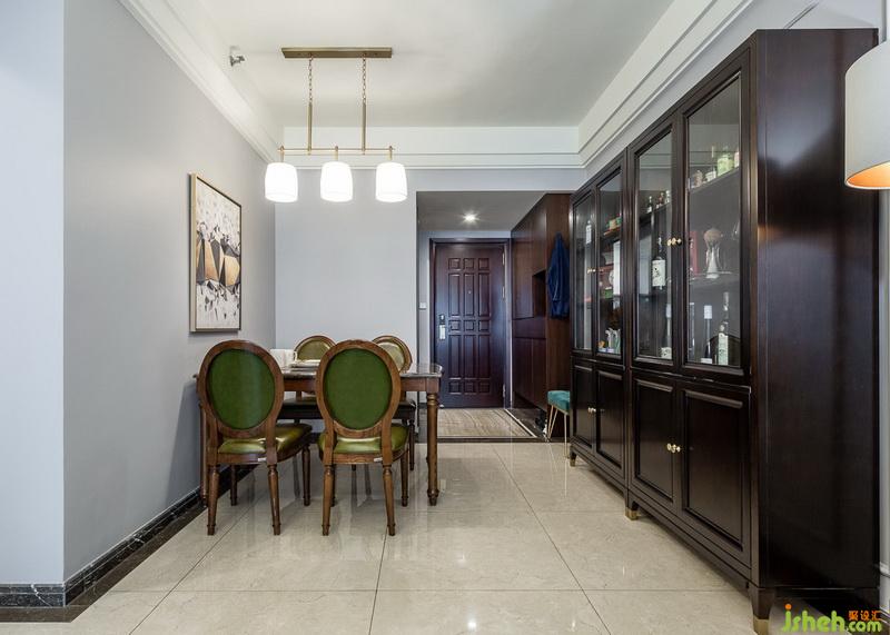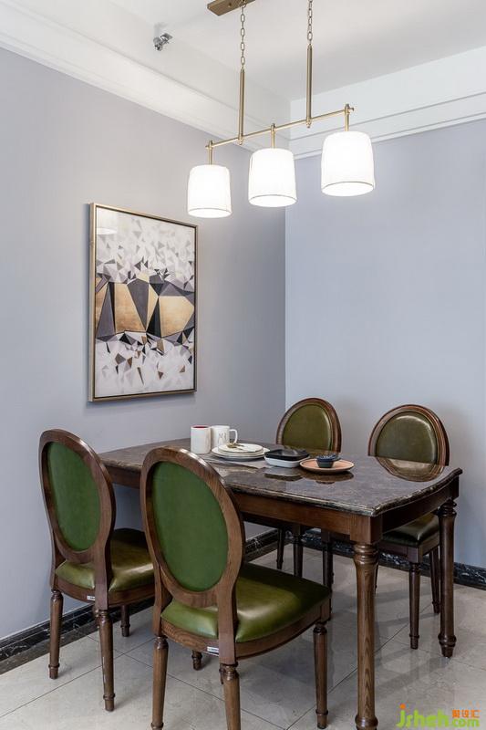 原有的餐桌也是傳統(tǒng)美式的設(shè)計(jì),同樣用金色邊框的裝飾畫,再加上黃色的幾何配圖。綠色的凳子呼應(yīng)著綠色的窗簾和客廳裝飾畫,黃色的裝飾畫也連接著窗簾和裝飾畫。