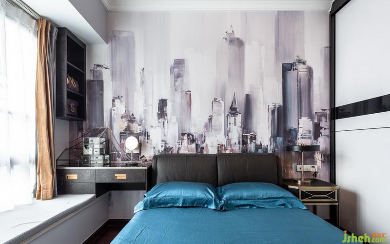 不要以為所有的原家具都是美式,現(xiàn)代感十足的床,那就搭配一下更摩登的背景墻紙吧,讓整個(gè)空間都有了色彩。