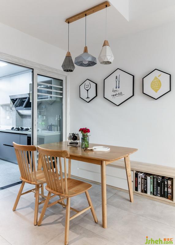 白色與木色搭配形成的儲(chǔ)物卡座,實(shí)用與美觀形成一體,原木色餐桌無形跟卡座相映成趣。閑暇時(shí),沖一杯咖啡,擺放一束花兒…