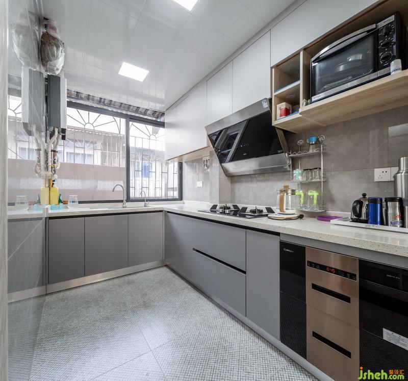 暖灰的冷靜與內(nèi)斂,把廚房從繁雜的日常中抽離,空間呈現(xiàn)出不同于瑣碎生活的整體感覺(jué)。