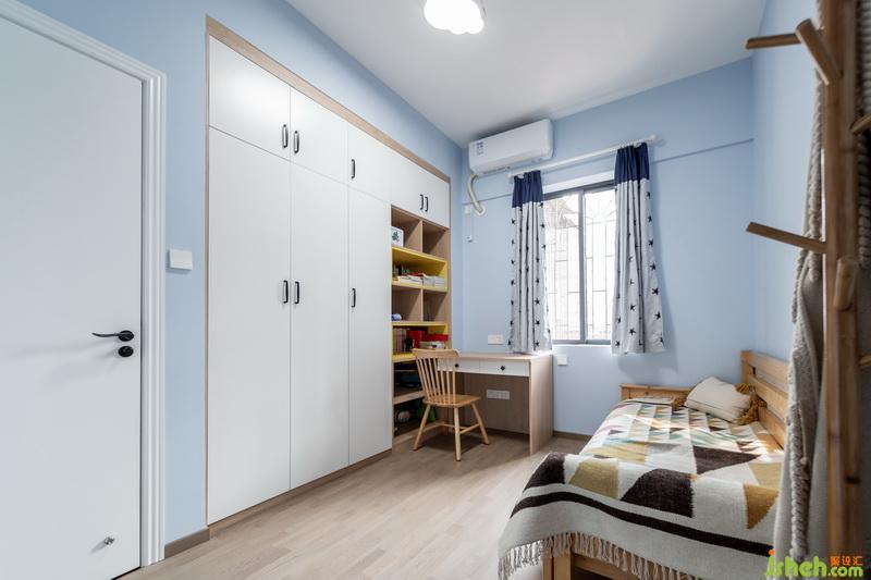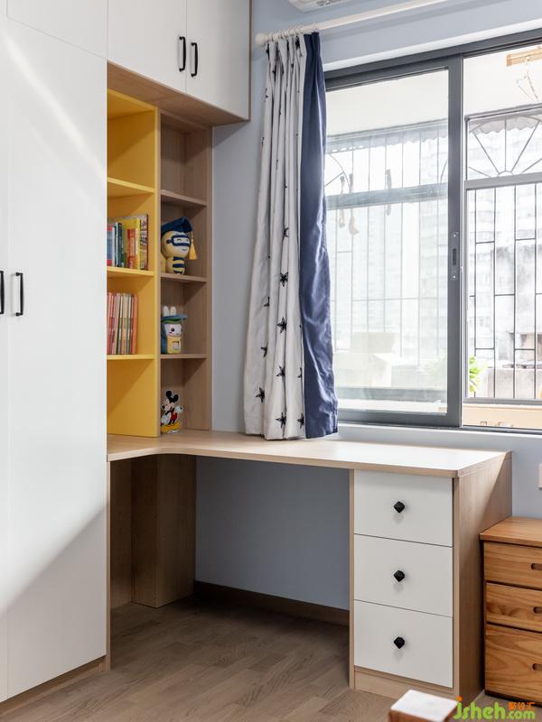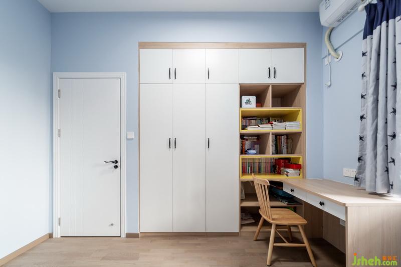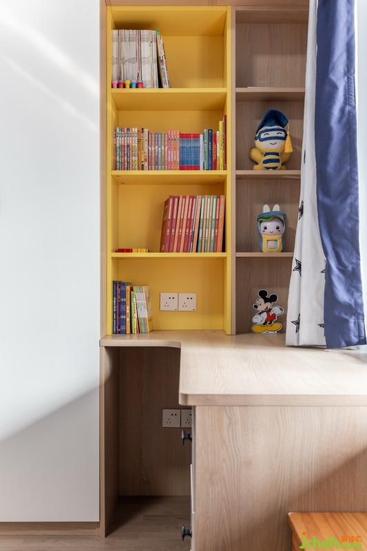 天藍(lán)色的墻壁,云朵造型的燈。黃色層板將書(shū)柜點(diǎn)綴得充滿生氣與活力,正適合小男孩聰明活潑的性情。