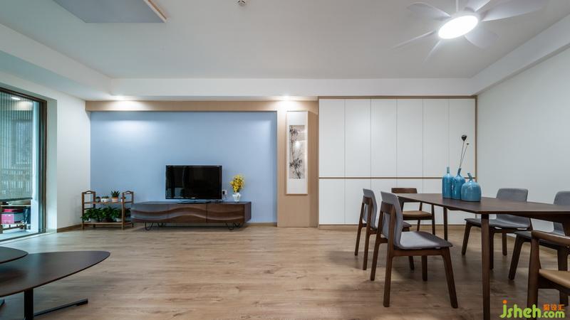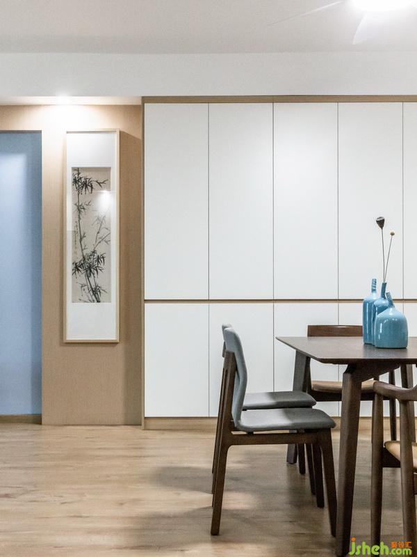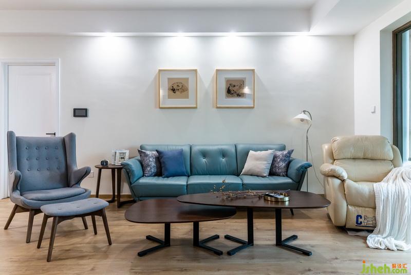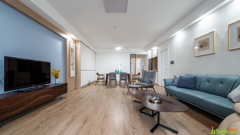 米色的休閑沙發(fā)也是家人用慣了的,找一個(gè)陽(yáng)光和煦的下午,踏上一套溫軟的毛毯,躺在躺椅上搖晃入眠。家的記憶一直都在。藍(lán)色的皮質(zhì)沙發(fā)在這個(gè)大空間略顯小氣,但無(wú)論如何,架不住業(yè)主對(duì)它的歡喜,軟硬適中,深度合適,大沙發(fā)的深度讓人不得不葛優(yōu)癱,小沙發(fā)保證舒適的同時(shí)又能氣度怡然。自是業(yè)主心頭好??蛷d到陽(yáng)臺(tái)之間,用木色草簾半做遮掩,光線斑斑駁駁灑進(jìn)來(lái),你都可以聞到空氣的味道,陽(yáng)臺(tái)改做的茶室,是周先生的小天地,會(huì)客甚至商務(wù)會(huì)談,皆可于此。