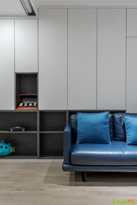 整個客廳有一組比較大的柜子,在這個柜子里面同時滿足了三大要求,一個就是閱讀空間,就是閱讀角;二是那個開放空間就是給孩子閱讀的空間,跟媽媽之間的互動空間。第三就是我們隱藏的書桌的空間,可以滿足她先生在家里辦公,但是平常不用的時候,可以把它合起來。