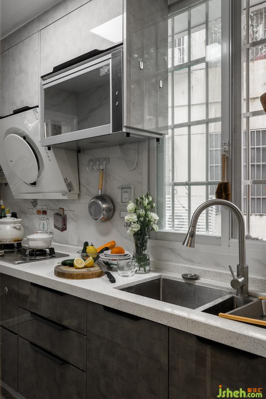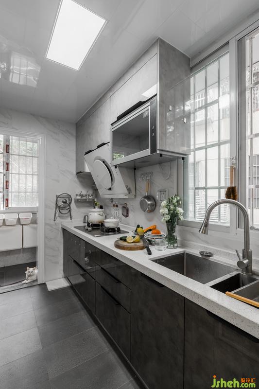 將原有的陽臺空間改為中廚區(qū),油煙大也不會影響客廳,而客廳原來的廚房則改為西廚區(qū),滿足女主人烘培的愛好。我們還將原有轉(zhuǎn)角位置獨立劃分出來,作為獨立的寵物空間。因為這個位置采光通風(fēng)包括后山的風(fēng)景都還不錯,男主人喂貓的同時在這里抽煙也是不錯的選擇。