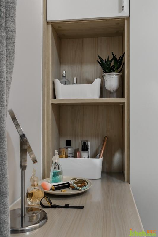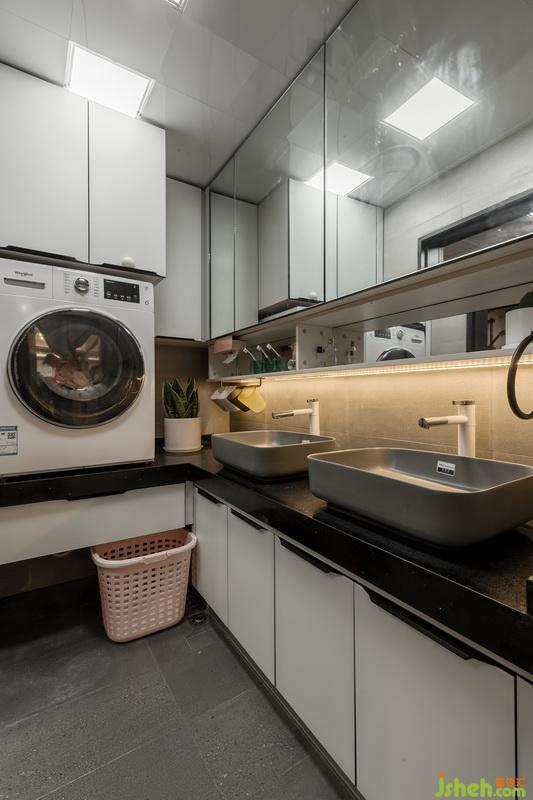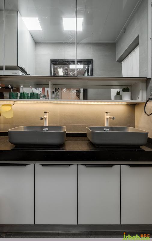 改動衛(wèi)生間進門位置,離臥室門更近,動線更合理。將原有的大衛(wèi)生間做了干濕分離的處理,一部分作為洗衣房兼洗漱區(qū),一部分作為衛(wèi)生間區(qū)域。因為只有局部沉箱,在馬桶方面我們選擇了壁掛式馬桶,壁掛式馬桶的墻排方式解決了馬桶改位的排污問題,同時,利用馬桶的包水箱位置,做了置物壁龕,一舉兩得。