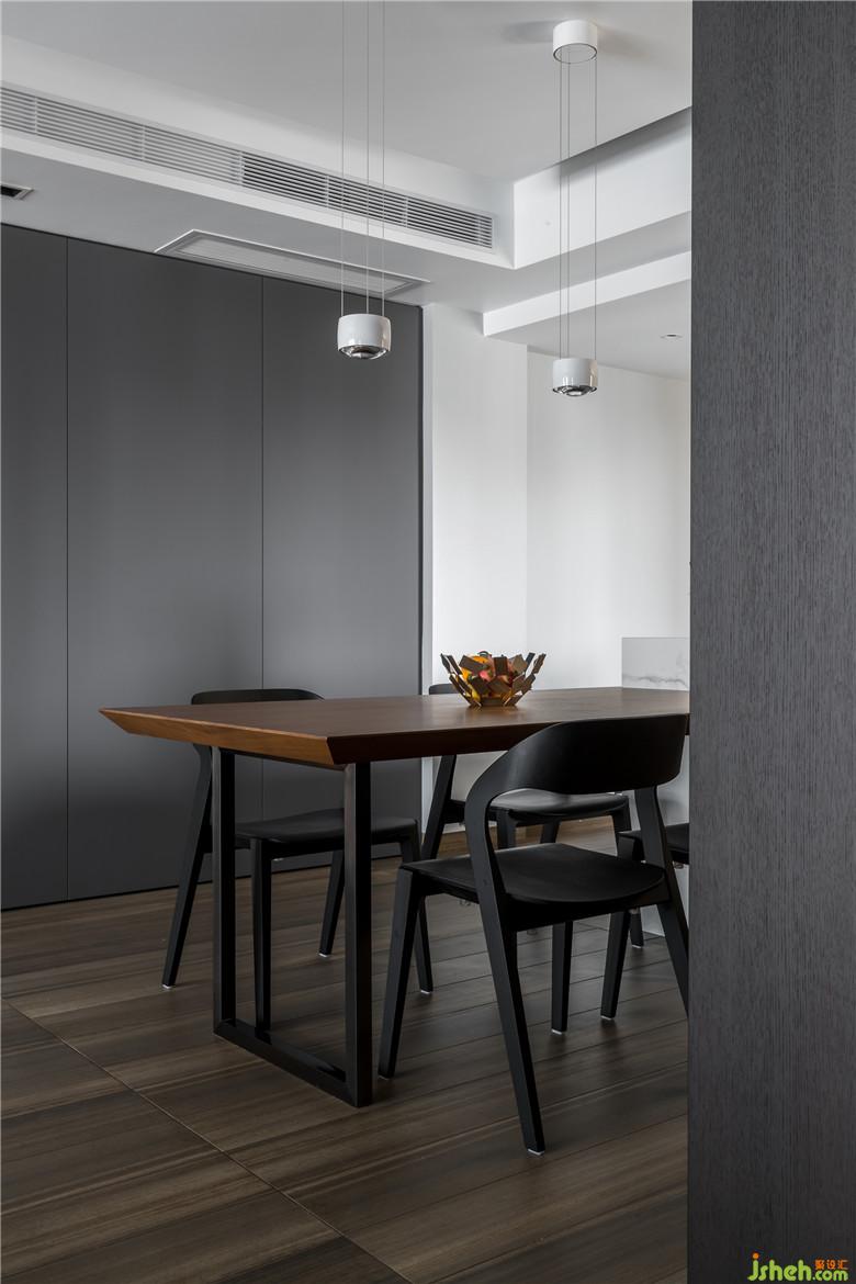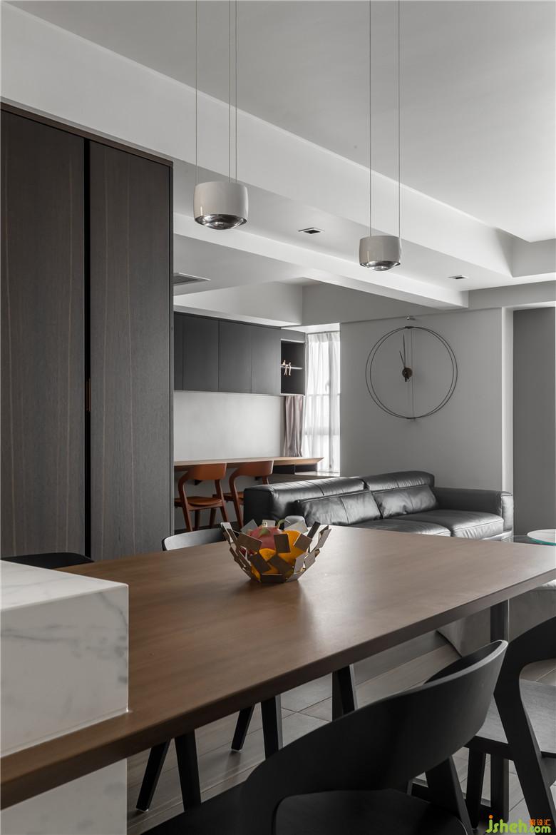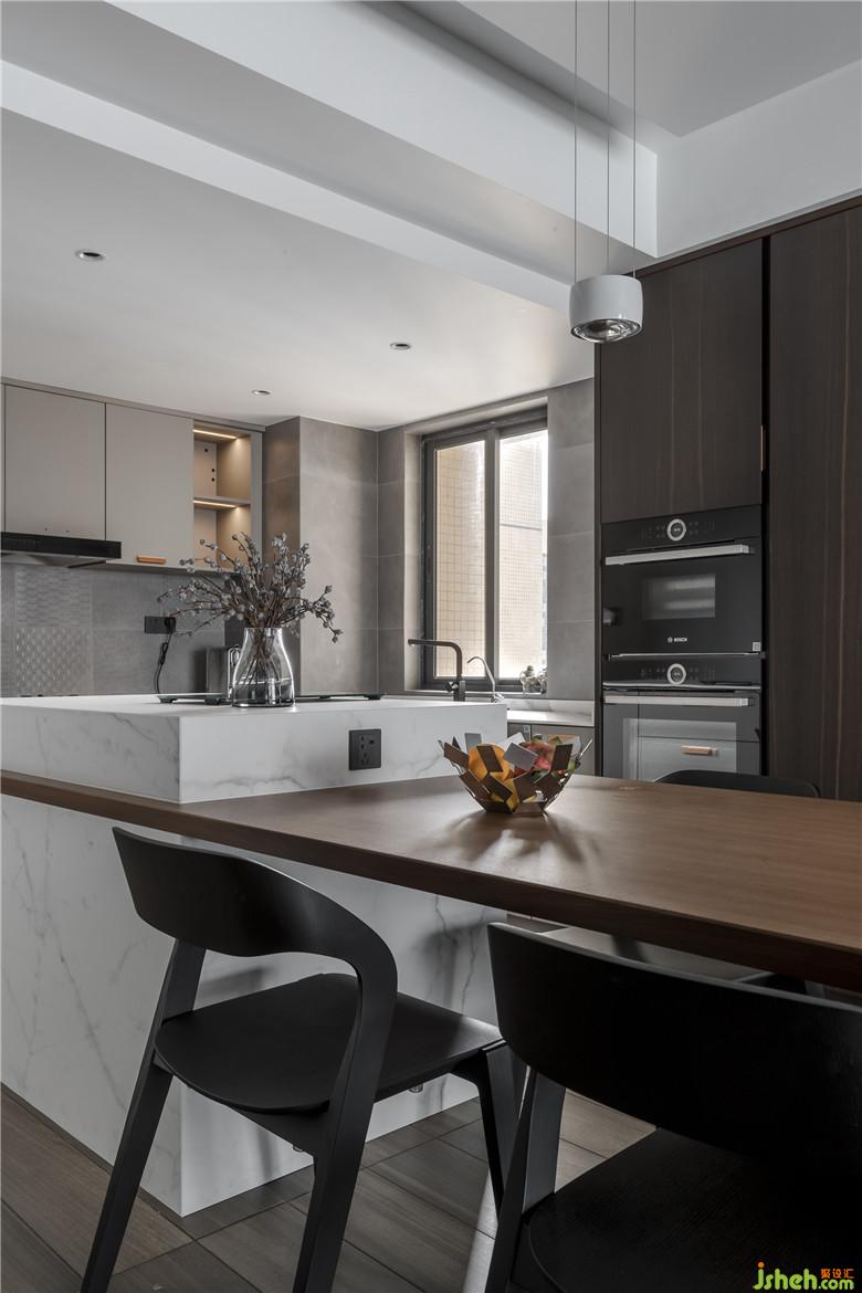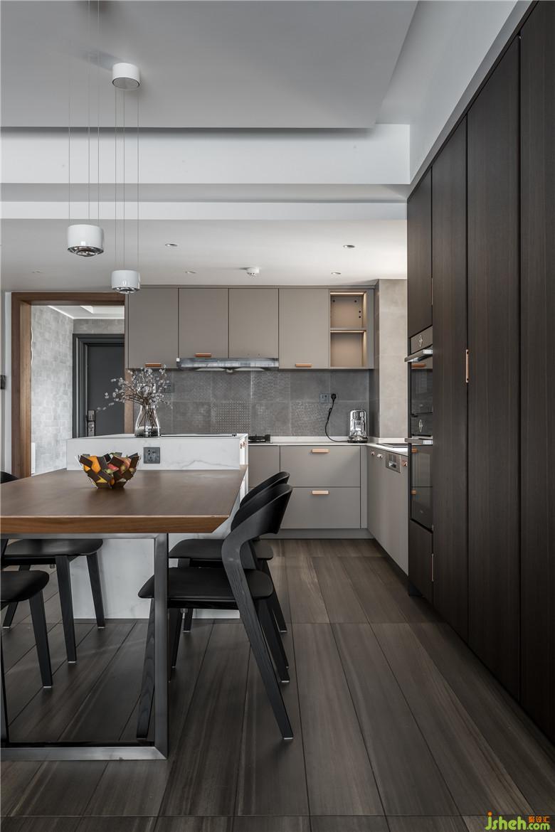 設(shè)計(jì)師設(shè)計(jì)出開(kāi)放式廚房和中島臺(tái),源于單身狗男業(yè)主不需要在家做飯,能夠滿(mǎn)足簡(jiǎn)單烹飪和西式料理即可。黑胡桃木門(mén)套、歐洲橡木煙熏木成了開(kāi)放式廚房的主宰,高柜硬朗紋路線(xiàn)條感搭配簡(jiǎn)單藝術(shù)吊燈,簡(jiǎn)雅中不失格調(diào),極簡(jiǎn)高級(jí)氣質(zhì)表達(dá)得淋漓盡致。