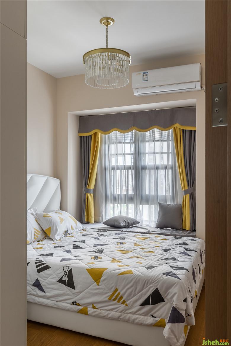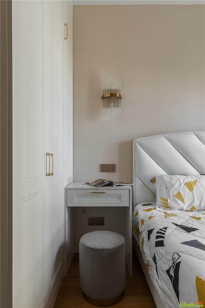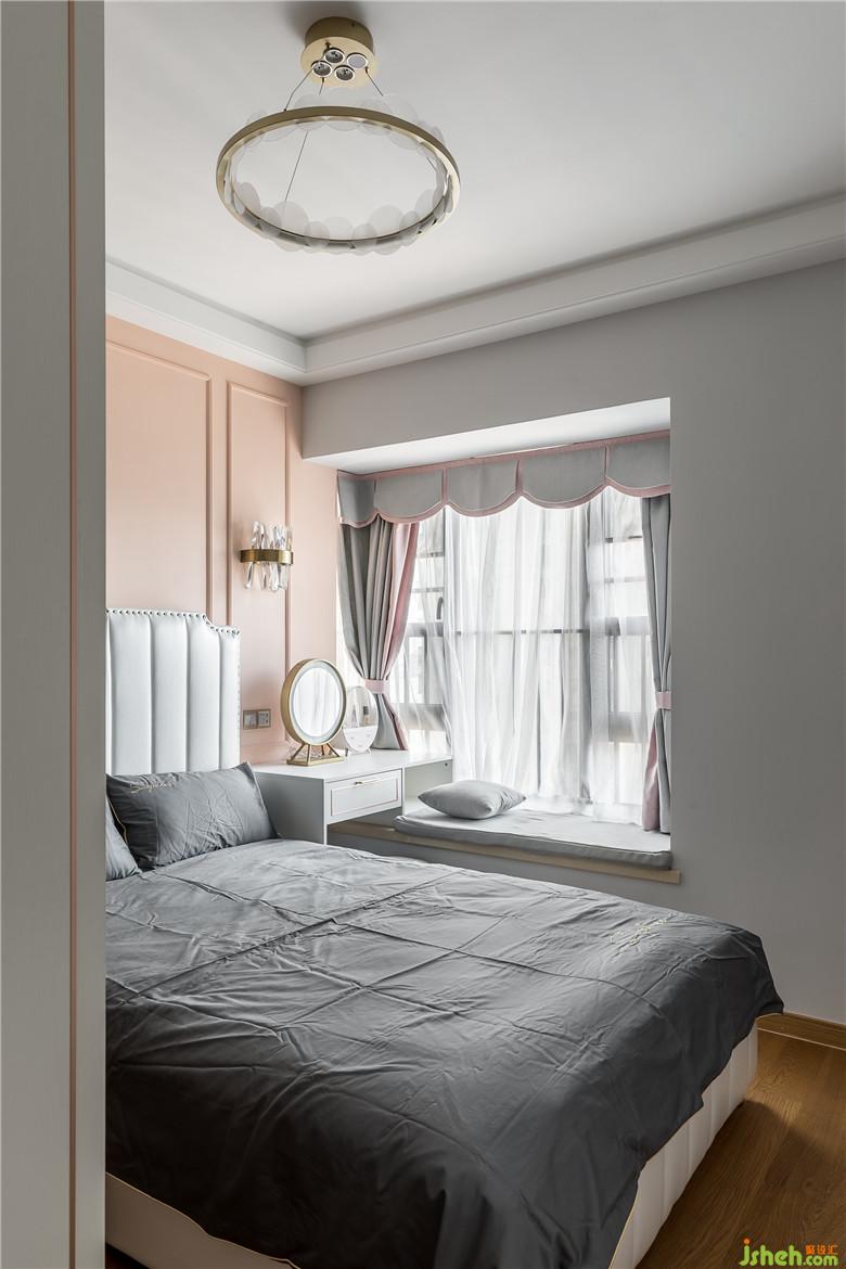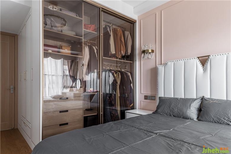 床頭背景以甜蜜溫馨的煙粉色為主調(diào),延伸客餐廳的石膏線條,其他墻面以淺灰色為輔,中和煙粉色帶來的甜膩,大面茶色玻璃衣柜使空間通透性更好,柜體里面的層板都有燈帶,透過里面的燈光,從外面看質(zhì)感是很高級,也是主人喜歡的輕奢感。