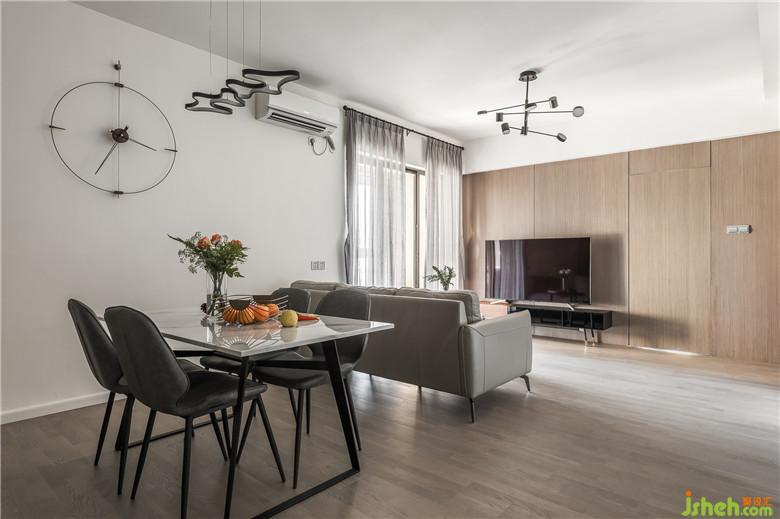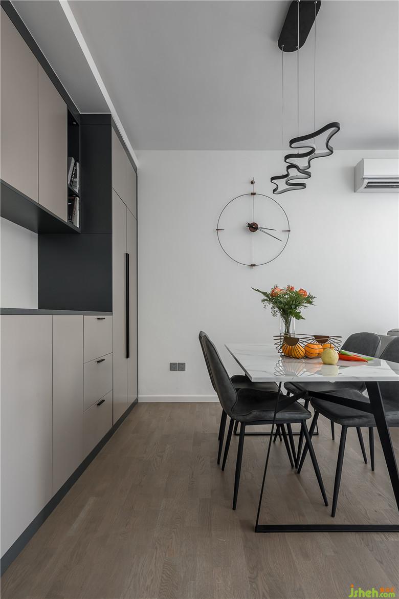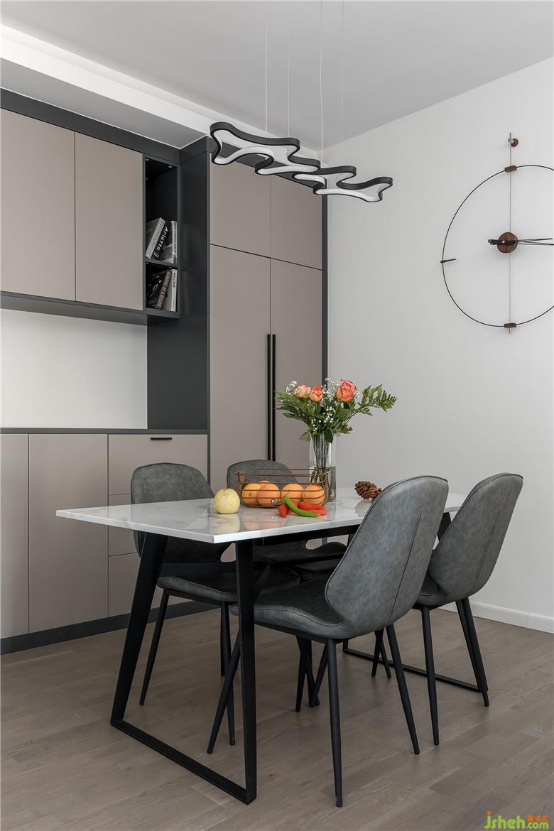 胡桃木色與煙灰色的結(jié)合讓空間更加簡(jiǎn)約大氣,胡桃木色結(jié)合本身富有質(zhì)感的紋理,木地板與背景飾面板的木色紋理的呼應(yīng),凸顯整個(gè)格局的亮點(diǎn),定制與門的材質(zhì)選用煙灰色與咖色的融合,避免了灰色的過(guò)于清冷,讓家的氛圍更加柔和,沙發(fā)選用簡(jiǎn)潔的灰白色,與爵士白大理石的餐桌融合,讓住宅更有格調(diào)。