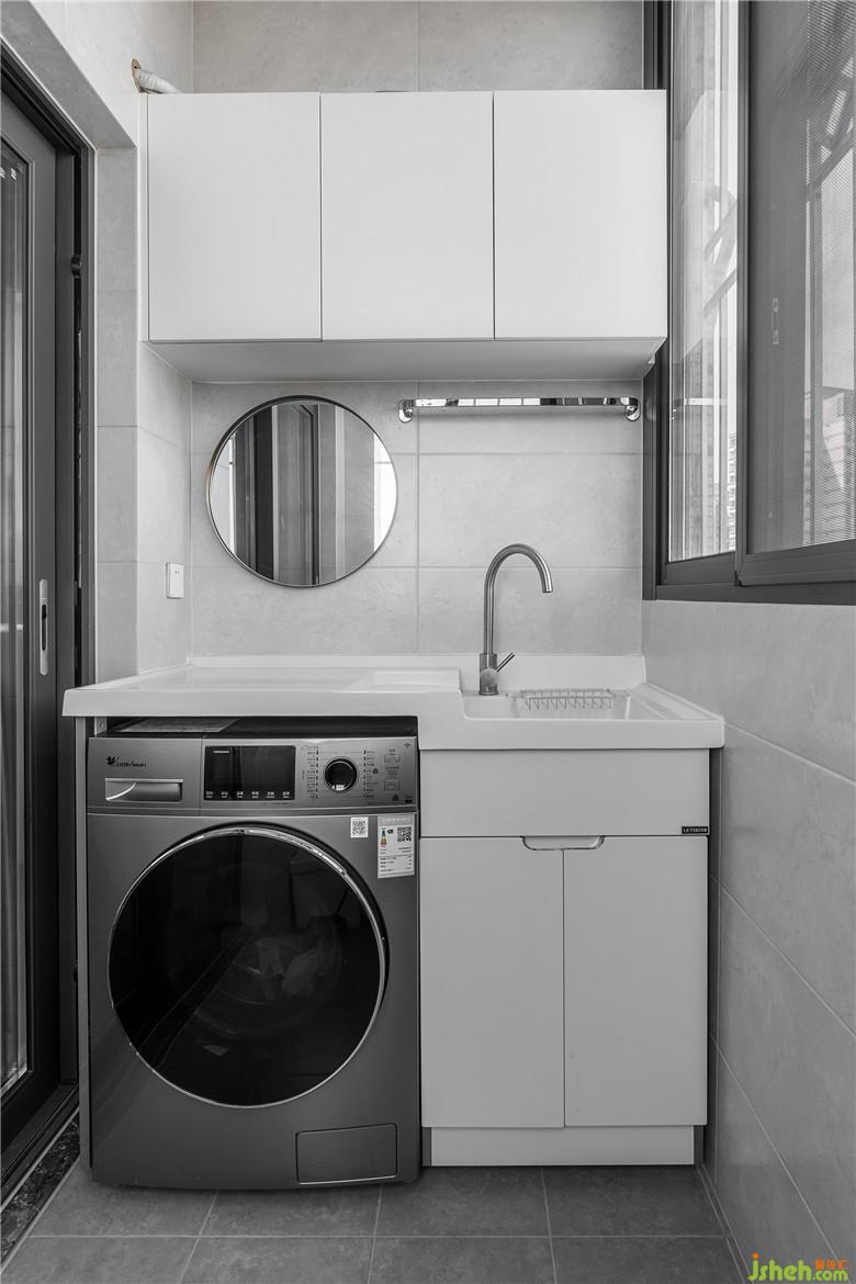 陽(yáng)臺(tái)的空間當(dāng)然也不能浪費(fèi),白色洗衣機(jī)柜與灰色地面瓷磚搭配顯得簡(jiǎn)單大方