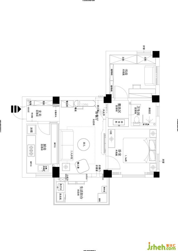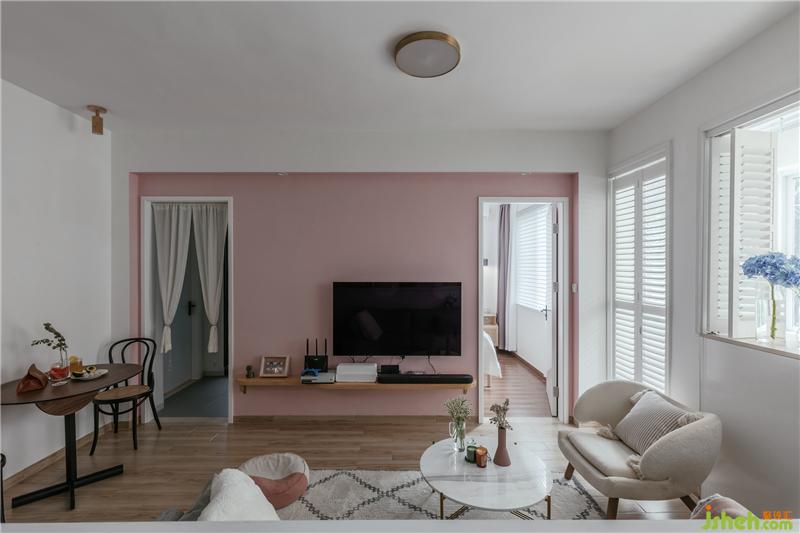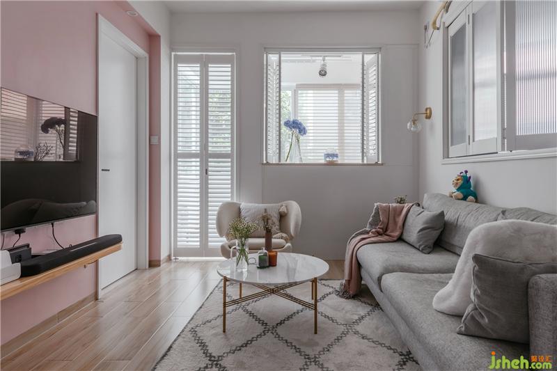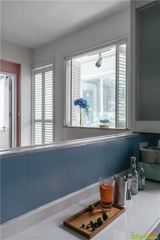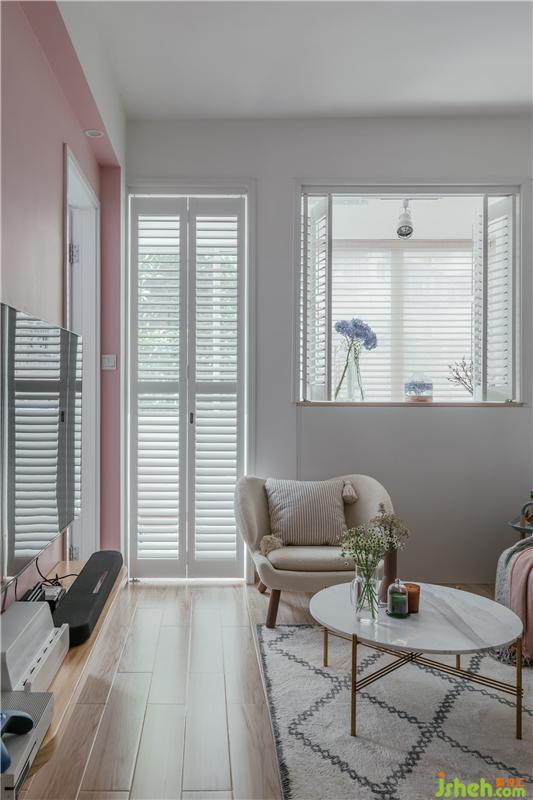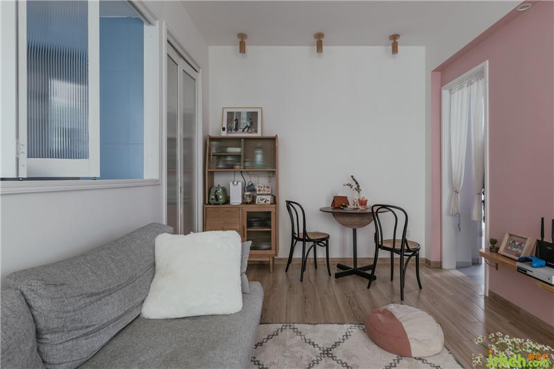 重點(diǎn)改造:室內(nèi)設(shè)計師把洗手臺從衛(wèi)生間移到外面,變成一個獨(dú)立的盥洗區(qū),改變主臥門;廚房向玄關(guān)擴(kuò)大了,墻全部打掉,和客廳鏈接的墻上做百葉窗;單獨(dú)設(shè)計了玄關(guān),可開放可封閉,很好地引入了廚房窗的光線。進(jìn)門后就是客廳的采光問題,與陽臺之間做了白色百葉門與可折疊百葉窗作為空間的劃分。陽臺是整個空間最好的采光點(diǎn)了。原有陽臺窗是打掉矮墻做成了吧臺,折疊窗可開可關(guān),真的很實(shí)用美觀。這個吧臺是這對年輕夫妻最喜歡的空間了。室內(nèi)設(shè)計師在色彩上運(yùn)用男業(yè)主喜歡的少女粉和天藍(lán)色來搭配,很符合這一對文藝男女青年的年輕夫妻的氣質(zhì)。