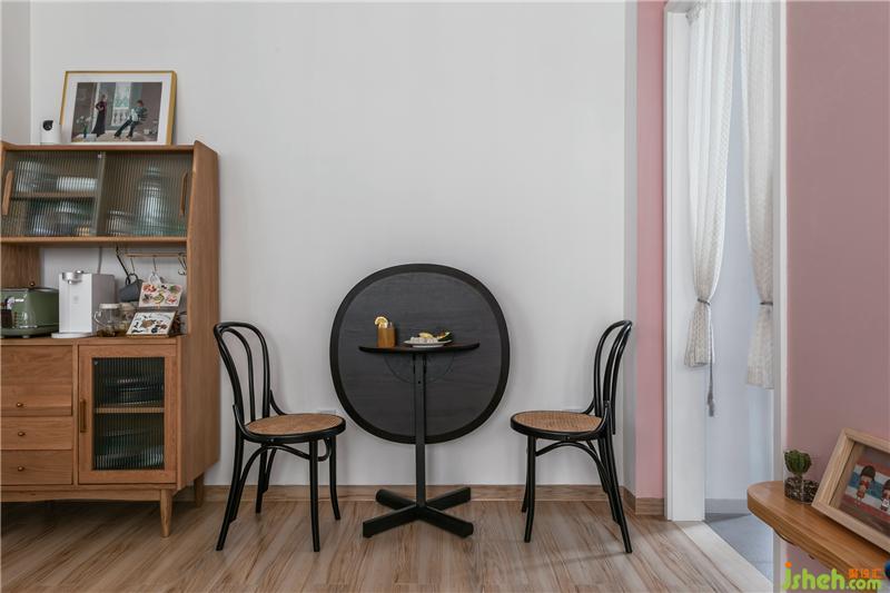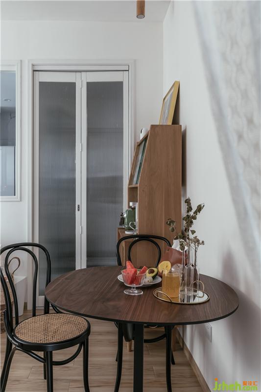 空間有限,沒有獨(dú)立的餐廳位置,因此使用折疊式的多變餐桌,用餐時是餐桌,休閑時又是小餐吧區(qū),多變還能節(jié)省空間。