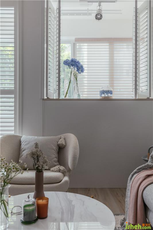 客廳靠陽臺的這邊是采光最好的空間,設(shè)計師用可調(diào)光的百葉門和百葉窗作為遮擋。