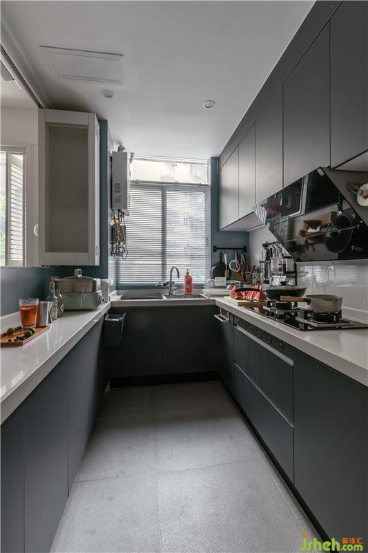 原來的廚房空間很小,對于愛下廚房的小夫妻來說,操作空間完全不夠。經(jīng)過改造后,整個空間往門廳移動,形成比較大的U字型操作臺。為了解決采光問題,在客廳和廚房間也做了白色折疊窗。室內(nèi)設(shè)計師考慮到打理性,這里采用了鋁合金材質(zhì)與長虹玻璃相結(jié)合的折疊窗,一方面可以阻隔油煙,另一方面增加采光。