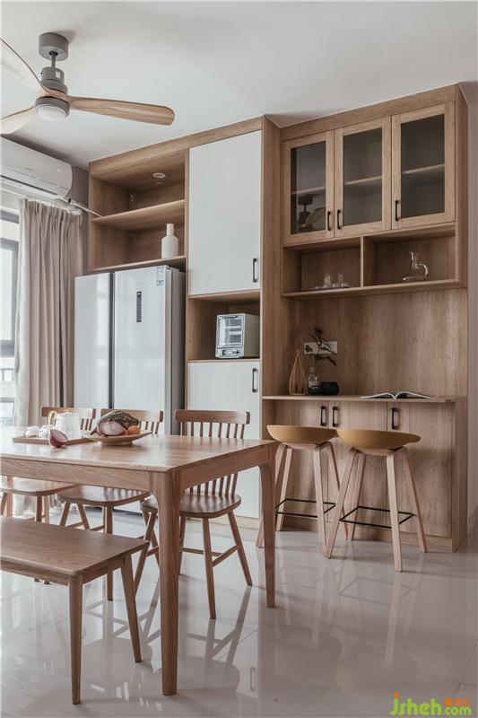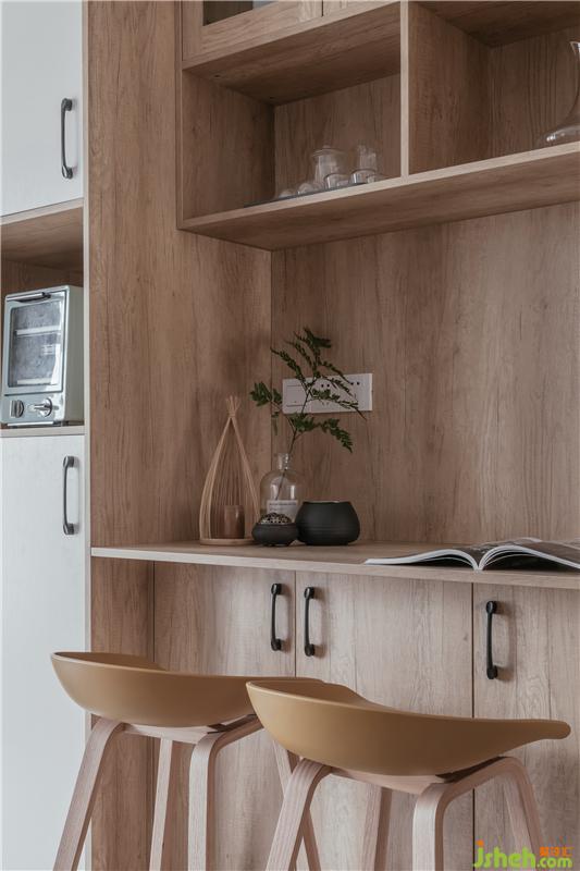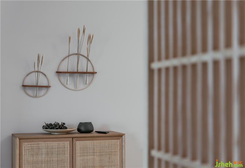 客餐廳做為整個(gè)家居空間最常用的互動(dòng)空間,木質(zhì)線條的日式格柵,很好的分割了兩個(gè)空間的動(dòng)線,讓兩者既區(qū)分又融合,沙發(fā)背景濃郁的日式風(fēng)格的掛畫(huà)結(jié)合成為了簡(jiǎn)潔空間的點(diǎn)睛之筆,純凈的白色透明玻璃花瓶,配上純潔的雪柳,軟化了原本木質(zhì)家具帶來(lái)的硬朗之感,賦予了這個(gè)空間溫柔優(yōu)雅的氣質(zhì)