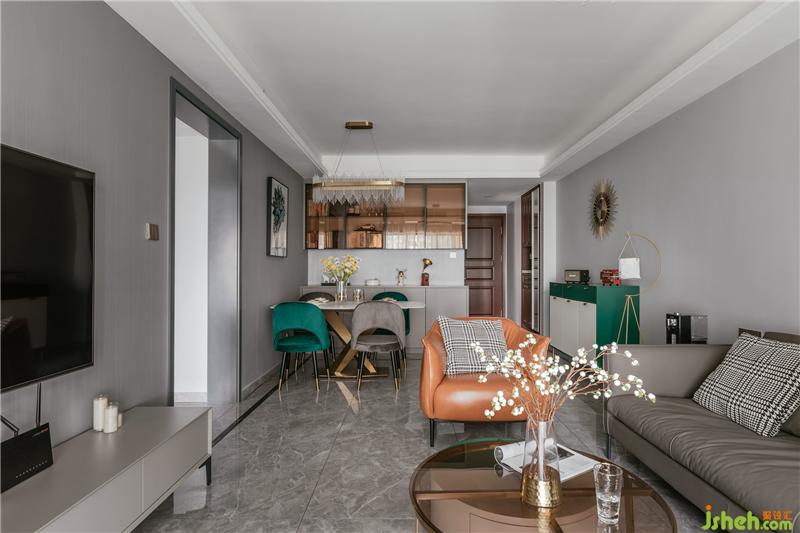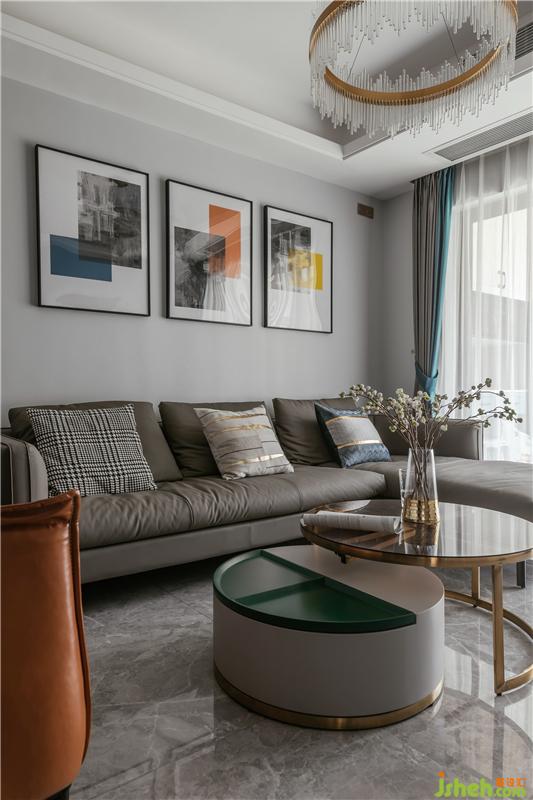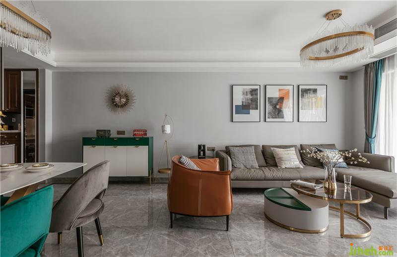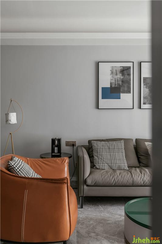 客廳整體用淺灰色調(diào),單人沙發(fā)愛馬仕橙色成了整個(gè)客廳的點(diǎn)亮之筆,掛畫與之呼應(yīng),顏色鮮明而獨(dú)特。