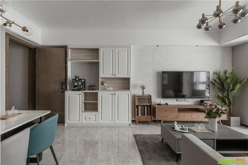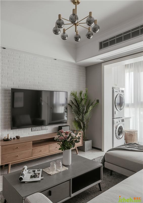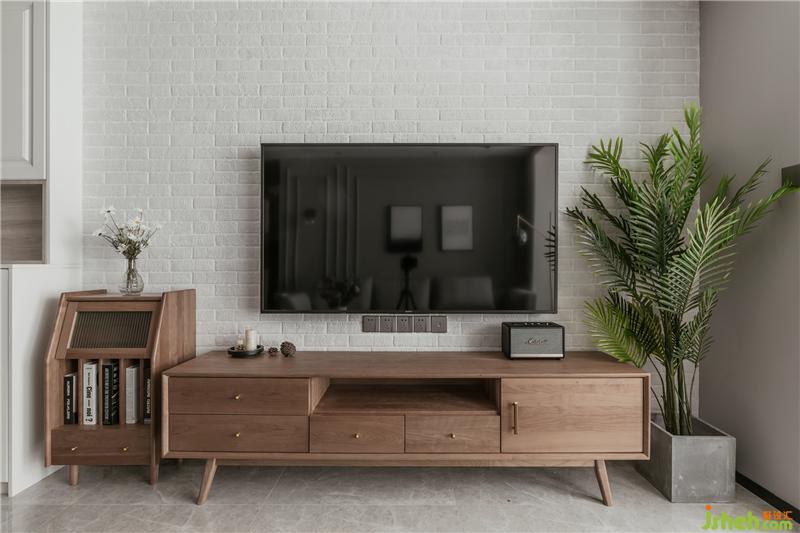 白色的文化磚背景,櫻桃木的電視柜組合又讓空間注入明亮溫馨。
