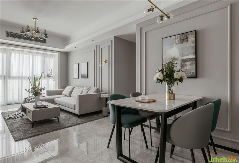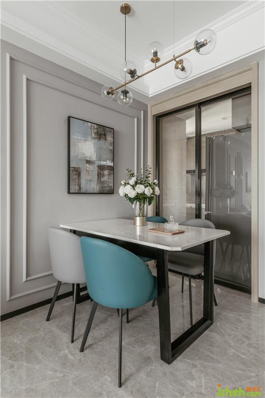 高質(zhì)感的大理石餐桌,灰藍(lán)色的餐椅再配上墻體的美式線條造型,讓就餐環(huán)境休閑放松且有儀式感。