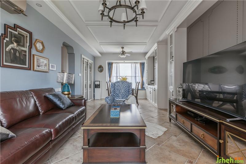 整體空間風格以美式鄉(xiāng)村為主,稍微帶點地中海風格的感覺。在色彩上使用了溫柔的淡藍色和白色的搭配,給人一種親近大海,大自然的感覺。