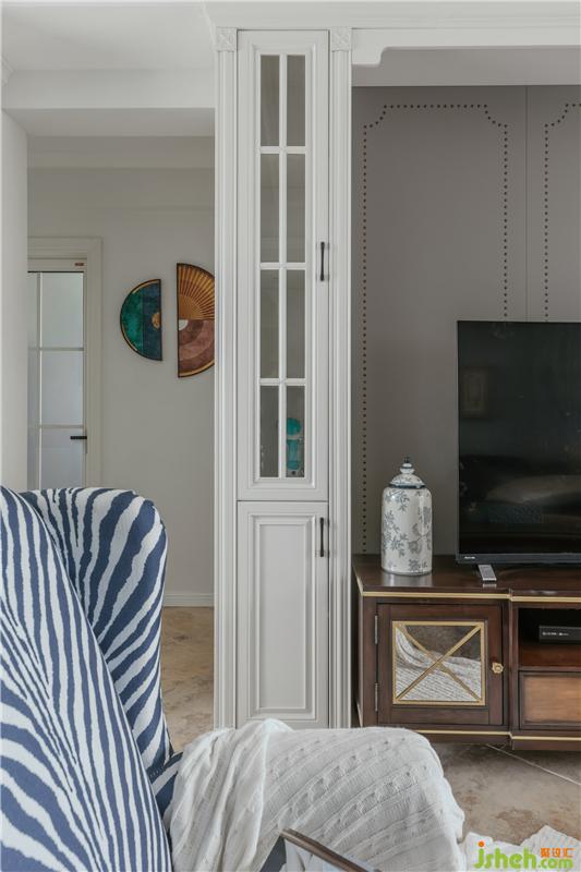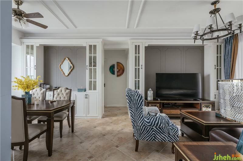 充滿藝術(shù)感的掛畫突出點亮了空間,異形的門洞造型,添加了一分靈動,美式的皮質(zhì)沙發(fā),小件裝飾和藍色斑馬紋單椅的美式造型,使藝術(shù)的躍動之美賦于空間之上,點綴的綠植使空間看起來更有溫度。