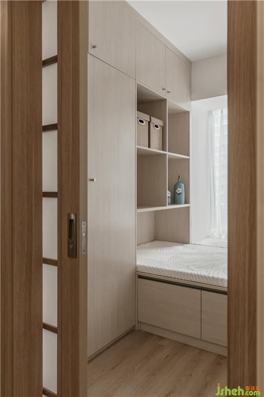 因?yàn)閷殞氝€未出生,所以這個(gè)房間主要作為父母臨時(shí)留宿使用,因?yàn)榇蟛糠謺r(shí)間還是沒有人使用,所以我們主要考慮整體美觀性與實(shí)用性,榻榻米能夠滿足到整個(gè)家的收納,看起來干凈整潔。