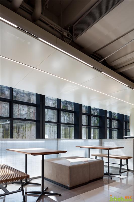 檔口的設計我們從巖層中獲得靈感,被設計成層疊彎曲的巖層造型,通過頂面鏡面的反射,更增加的巖層峭立的感覺,也為從這個“巖層”里制作的美食,增加了些許神秘感。