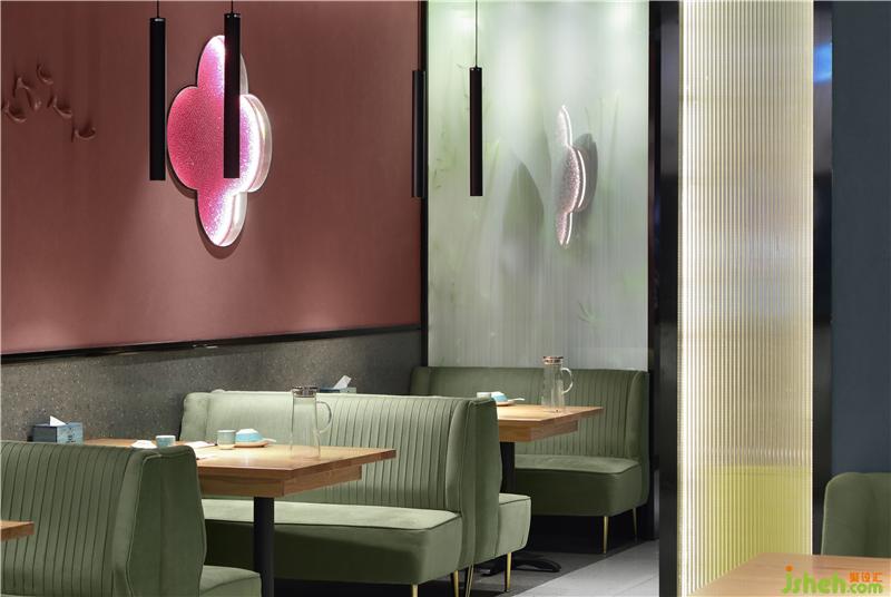 設(shè)計(jì)師提取辣婆婆品牌標(biāo)識(shí)中的元素,經(jīng)過抽象與變化,形成了辣婆婆北京概念店空間特有的視覺符號(hào)——嬌艷的紅色與一條優(yōu)雅的弧線。