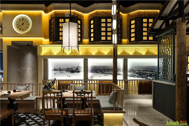 七彩石的地面,米色灰色肌理漆,青石臺(tái)階、墨綠色通高隔斷,灰瓦木柱二層小樓,我們?cè)谖⒖臻g里醞釀老城故事,用舌尖體驗(yàn)五味幸福。