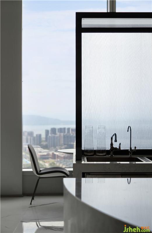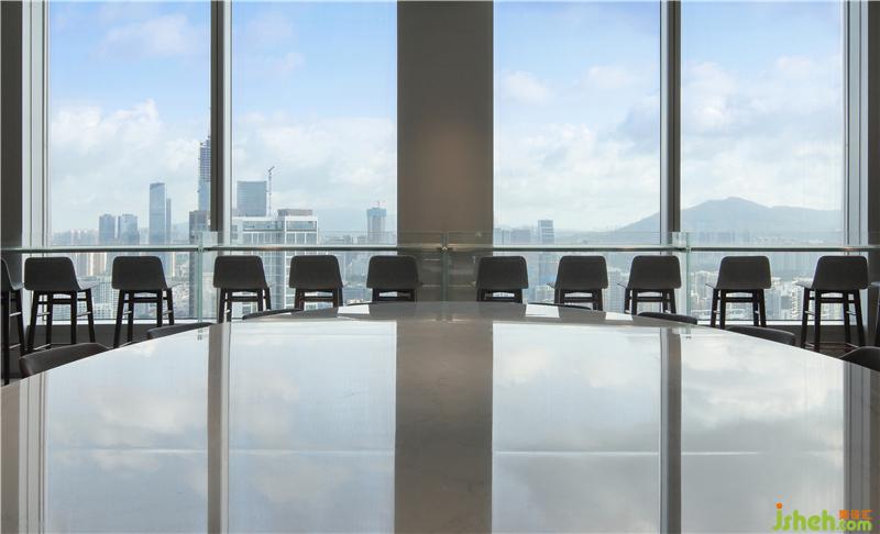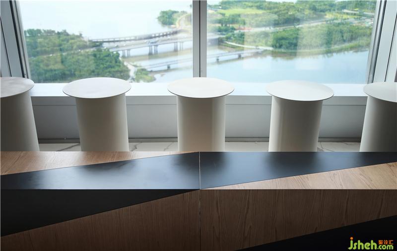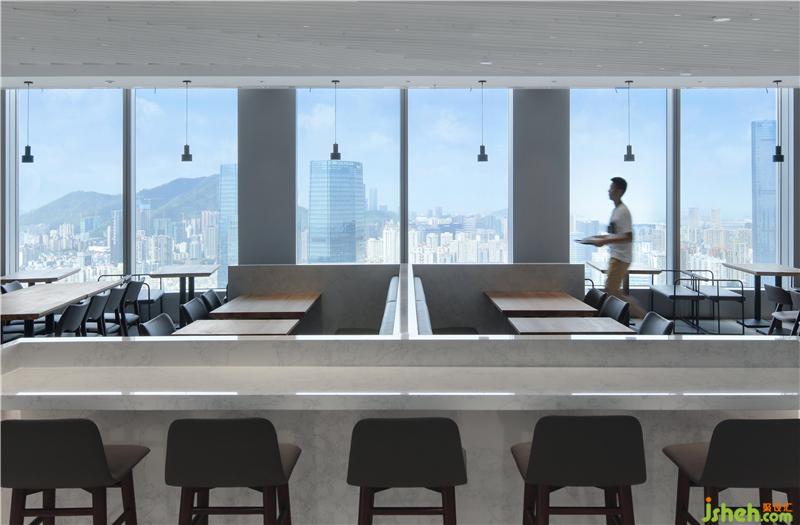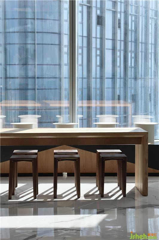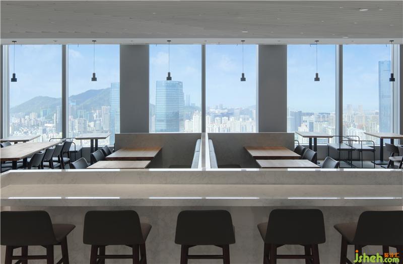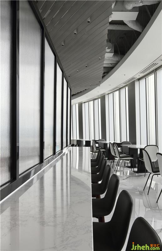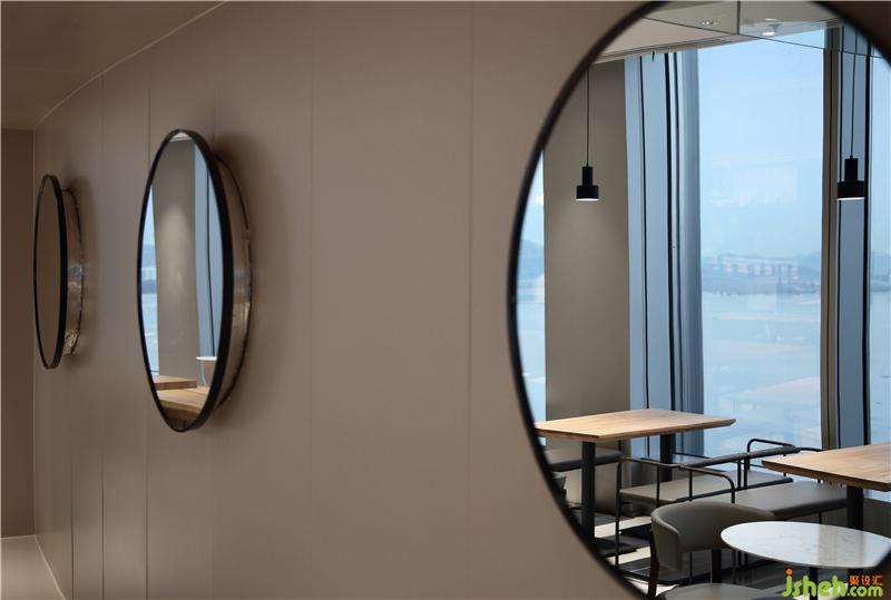 在都市景觀面設(shè)置了一些“景觀框”,將標(biāo)志性的都市建筑景觀納入框景,欣賞到窗外都市中最美的那個點。在離窗戶較遠(yuǎn)的就餐區(qū)域采用“借景”手法,通過墻上鏡面,將窗外的美景反射到室內(nèi),在任何一個角度都可以欣賞到高空美景。