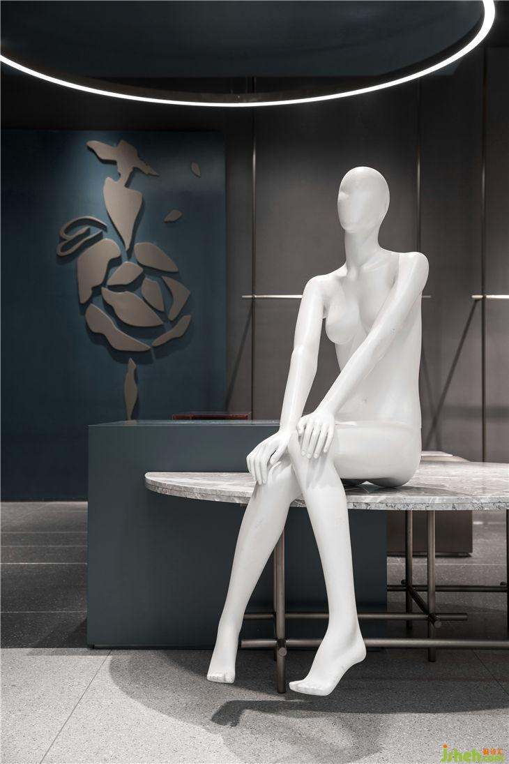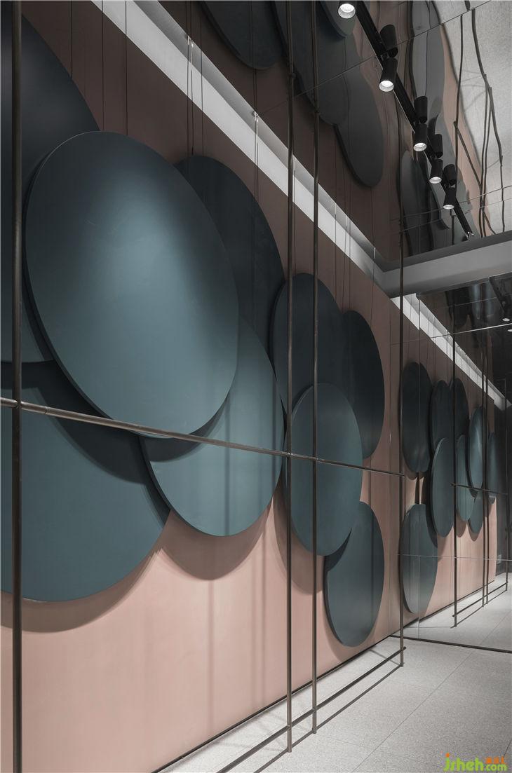 為了在空間里達(dá)到視覺上新的認(rèn)知驚喜與商業(yè)趣味性,在天花局部使用鏡面金屬,在橫向與豎向的空間達(dá)到延伸與折變,獲得新的視覺體驗;