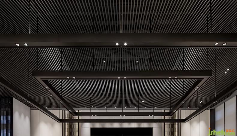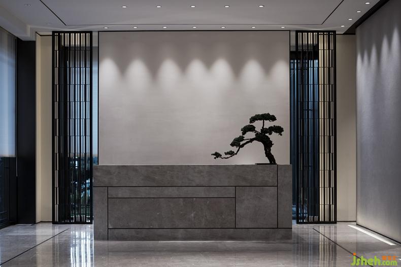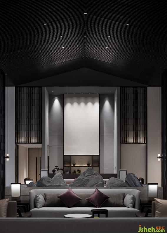 我嘗試用一個極簡美的設計元素,一道白墻與似雨絲似屏窗的格柵,通過空間的不同組織來探索空間的節(jié)奏與韻律。結果出現(xiàn)一個意想不到的空間體驗,當豎線條與一層層山巒重疊的白峰(白墻)穿插后,很難清楚是雨霧是光影是……