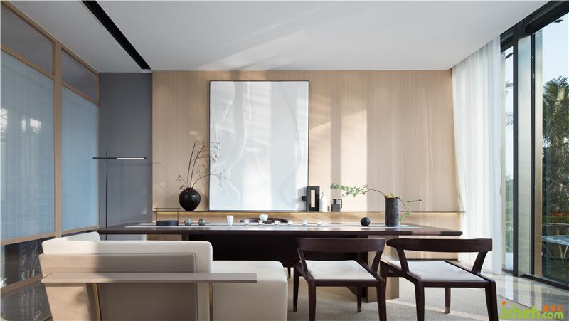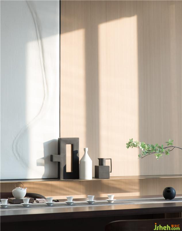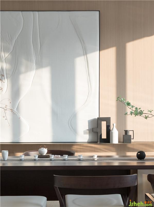 屏風(fēng)模糊了空間界限,茶室似隔似合,藝術(shù)畫的選擇以留白注解,若隱若現(xiàn)。器皿選色素雅,插花藝術(shù)更是展現(xiàn)了不一樣的空間詩(shī)意美學(xué)。文人墨客,清茶一杯,談吐風(fēng)雅;蕓蕓眾生,一茗在手,靜謐中返觀自心。