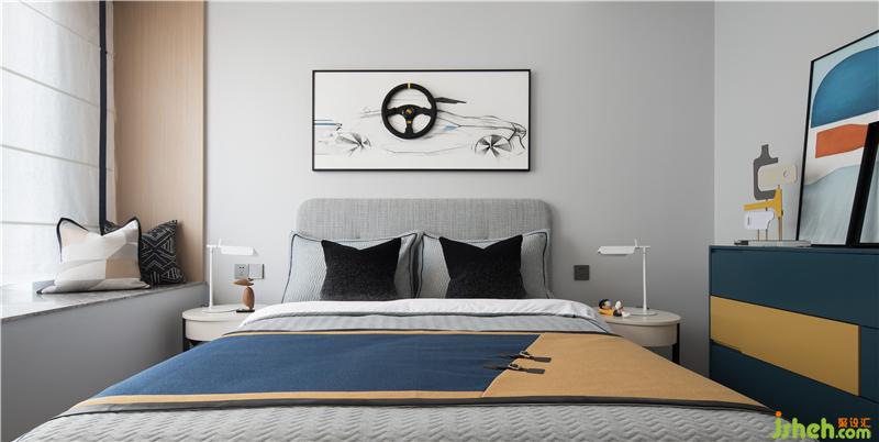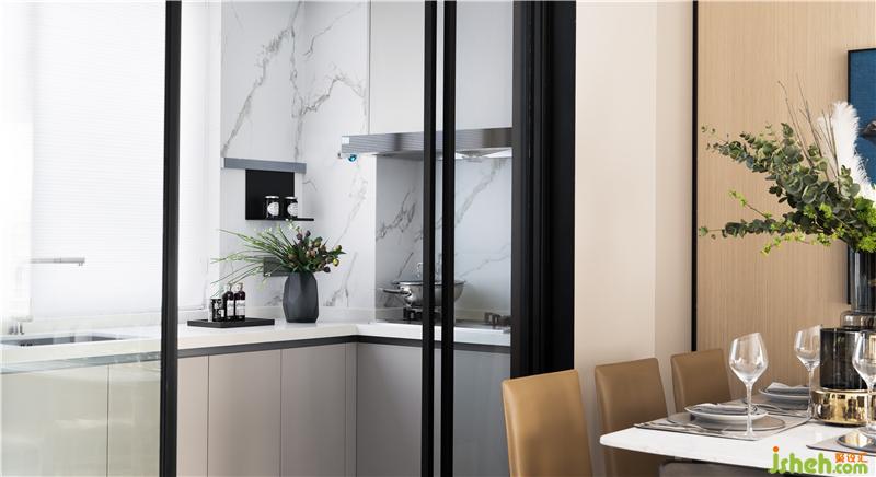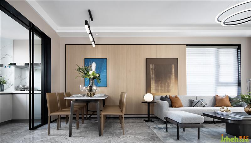 餐廳與客廳做好區(qū)分,餐廳背景墻選用整面的暖色木紋,營造溫暖又和諧的用餐環(huán)境,既增加了整體的區(qū)塊感,也最大限度的保留空間的通透性。樣板房設計